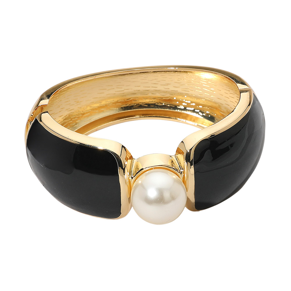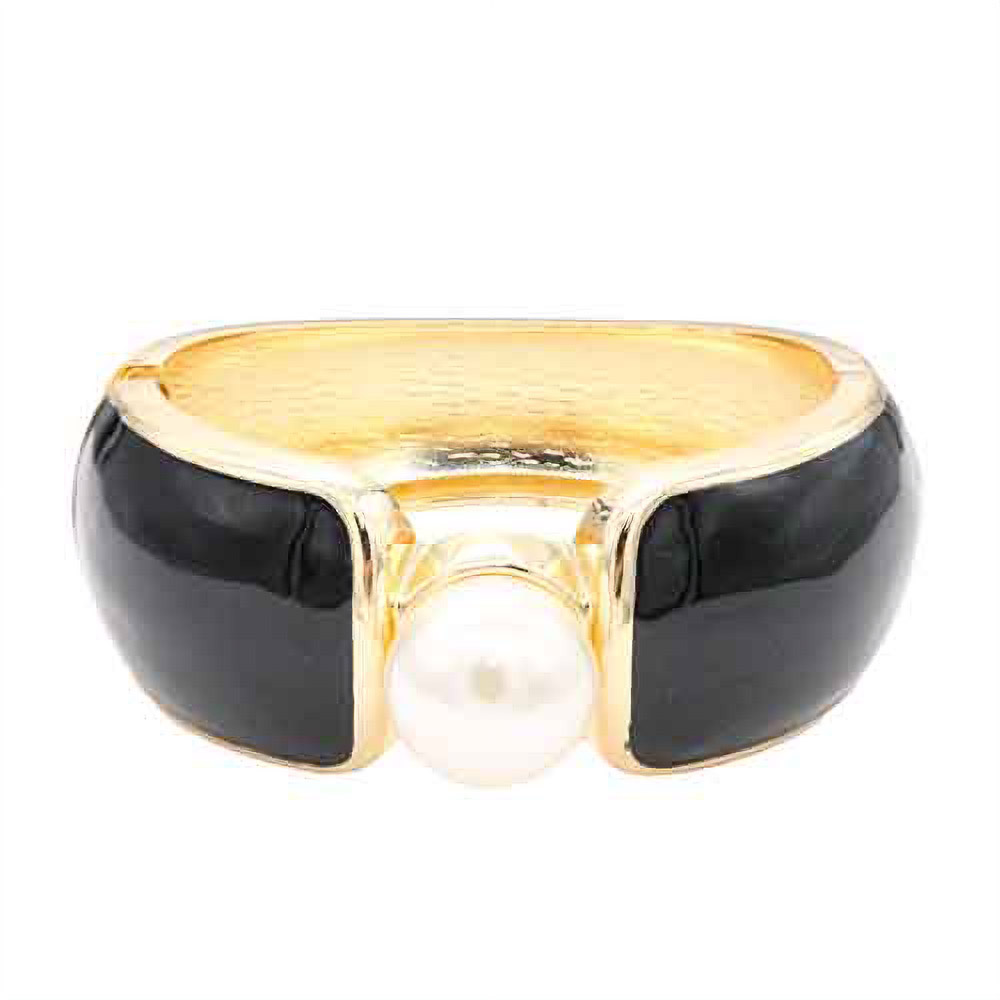 Details • Size : 1.2" H, 2.5" D • Hinged Closure • Chic wide cuff bracelet featuring a smooth enamel finish and bold central pearl accent for a sophisticated look. Perfect for adding elegance to any outfit, this statement piece offers a modern twist with a secure hinged closure and polished finish ideal for day or evening wear. • Lead and Nickel Compliant