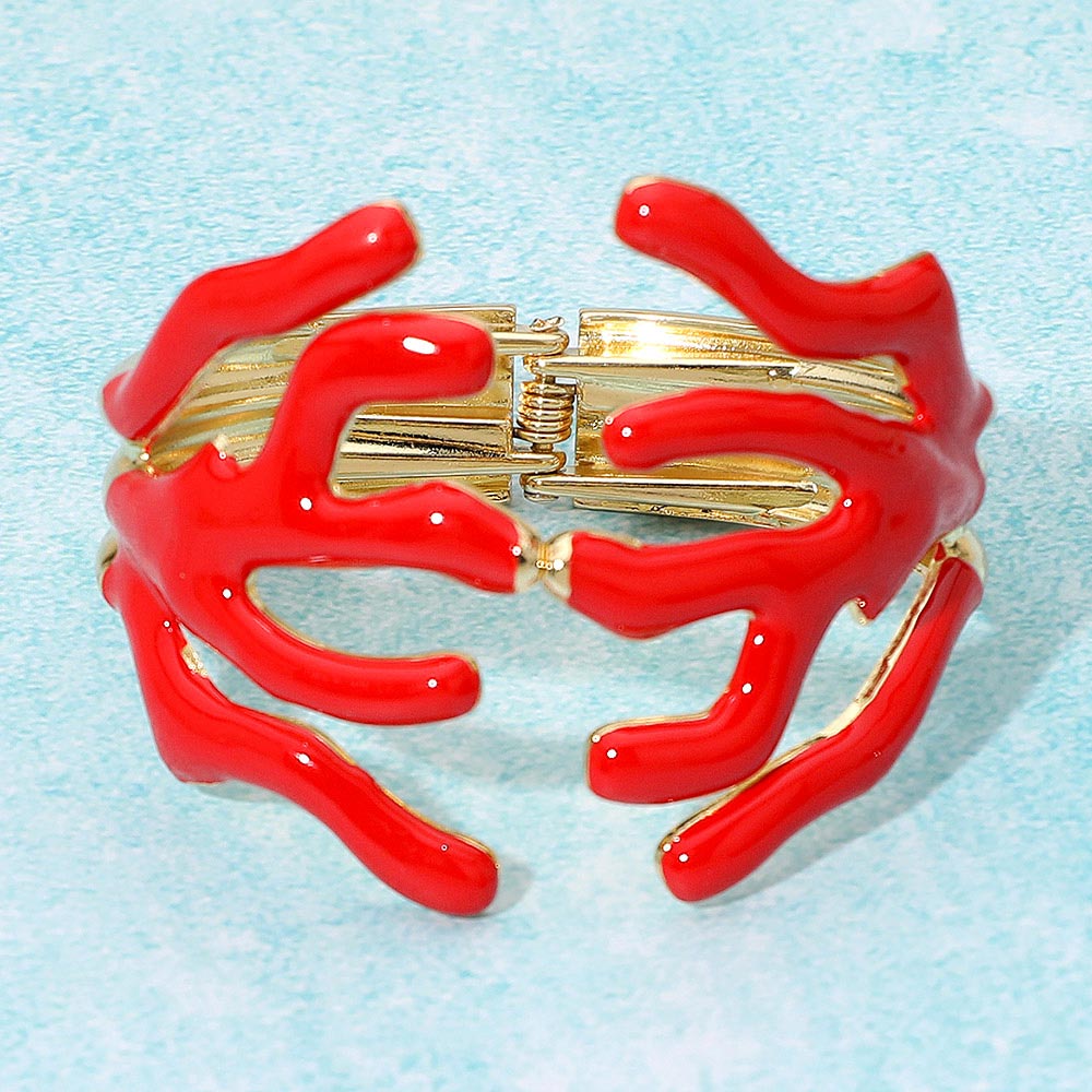 • Bold coral-inspired openwork bracelet featuring fluid branch-like shapes for a modern, sculptural look. Designed with a hinged closure for comfort and style, this statement piece adds a touch of artistic elegance to any outfit, perfect for both casual and evening wear.