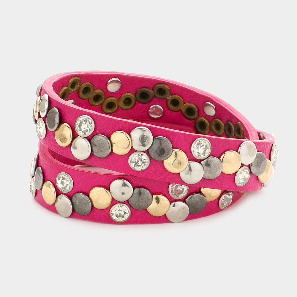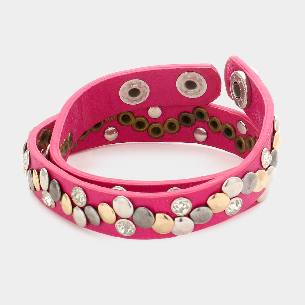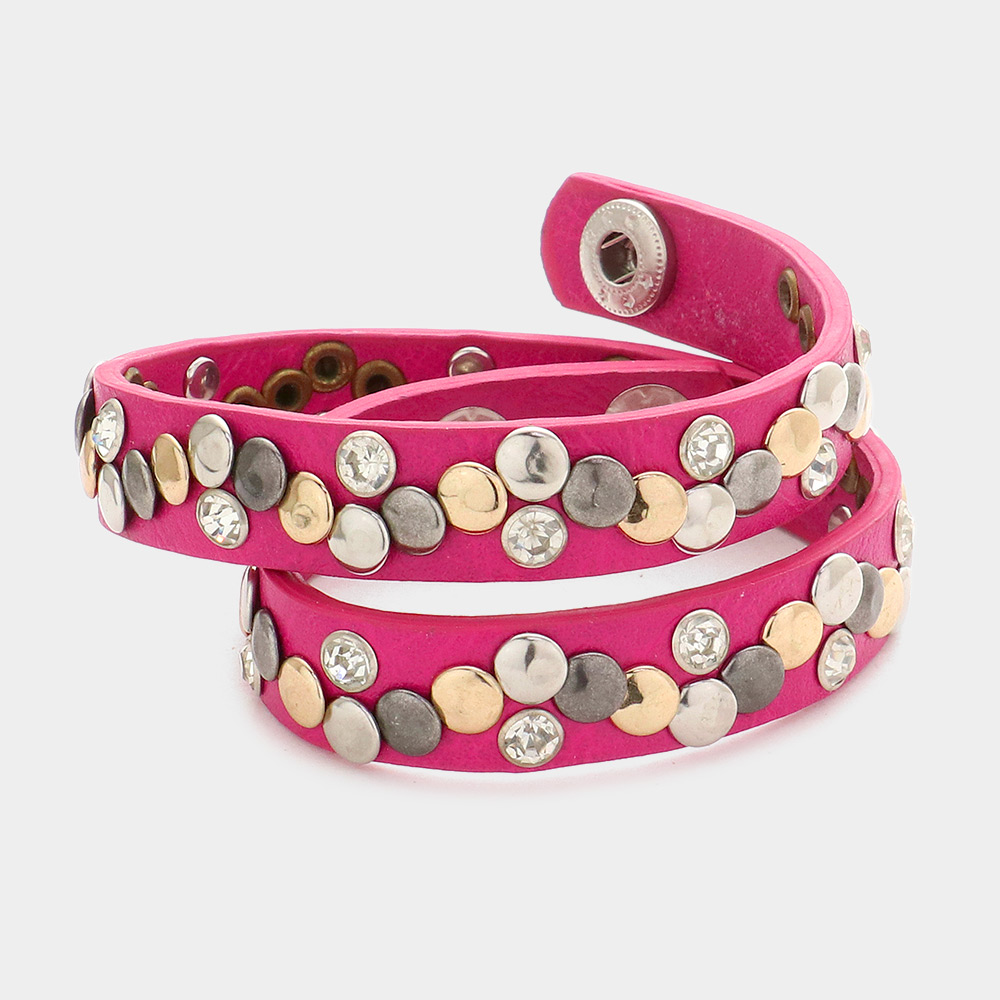 Crystal Hammered Metal Studded Faux Leather Band Bracelet