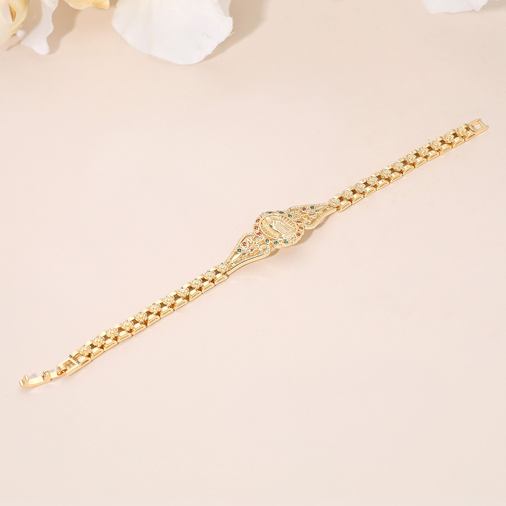 Details • Size : 0.75" H, 7.25" + 0.5" L • Fold Over Closure • Elegant filigree bangle bracelet featuring an religious ornate oval medallion centerpiece surrounded by sparkling gem accents. Its intricate openwork design adds a touch of vintage charm, making it a beautiful statement accessory for special occasions or everyday sophistication. • Brass • CZ Cubic Zirconia