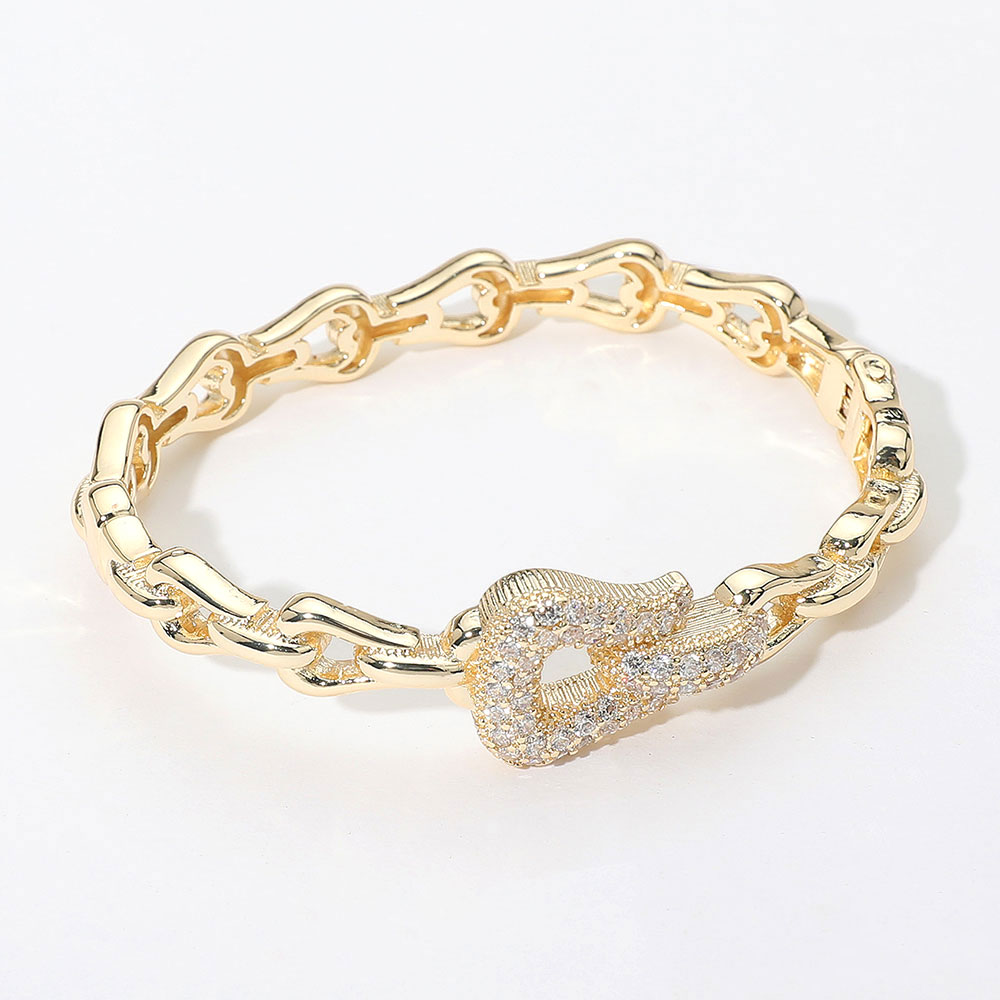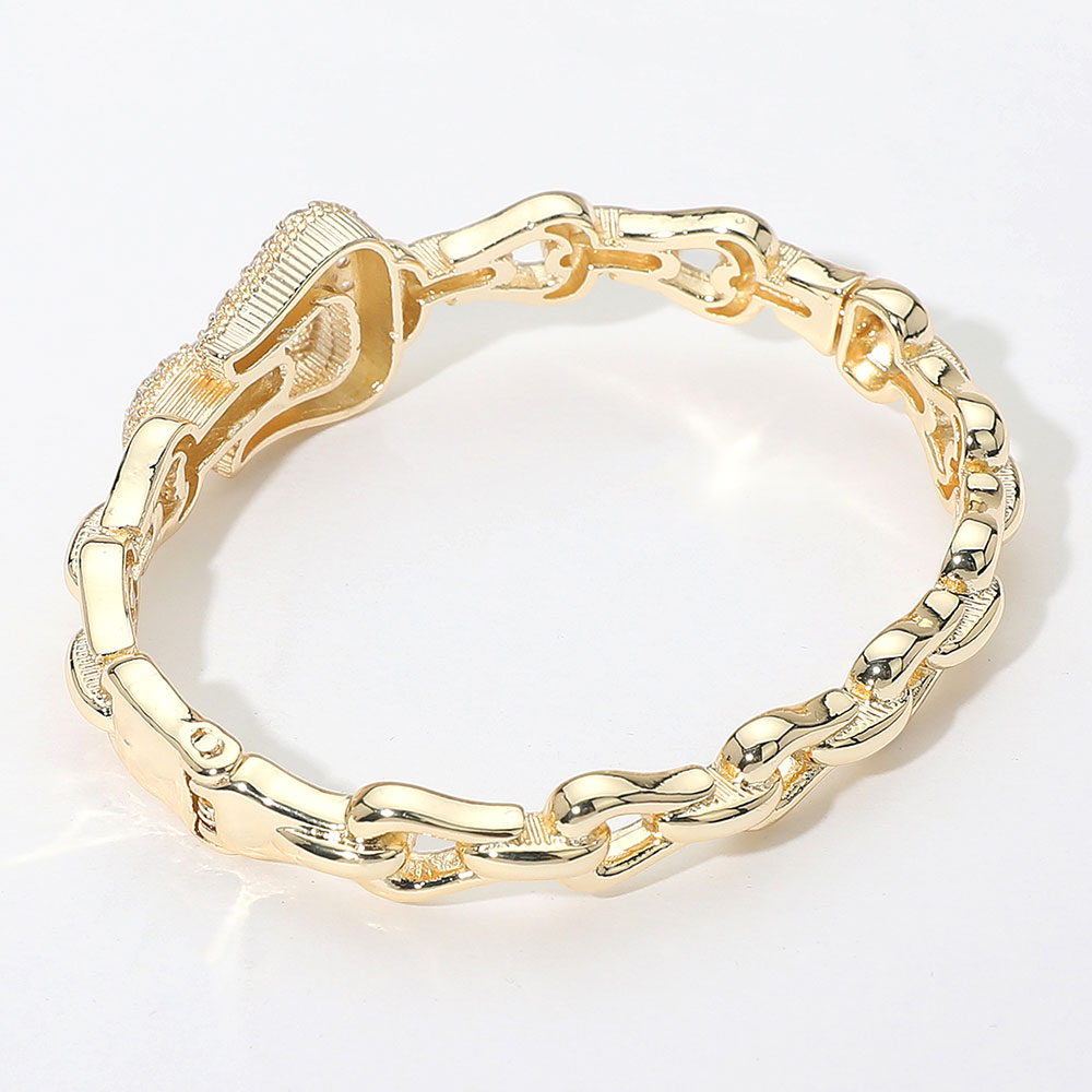 • Bold link chain bangle featuring a crystal-encrusted buckle accent. Luxe shine with secure clasp. A statement piece for elevated everyday wear.