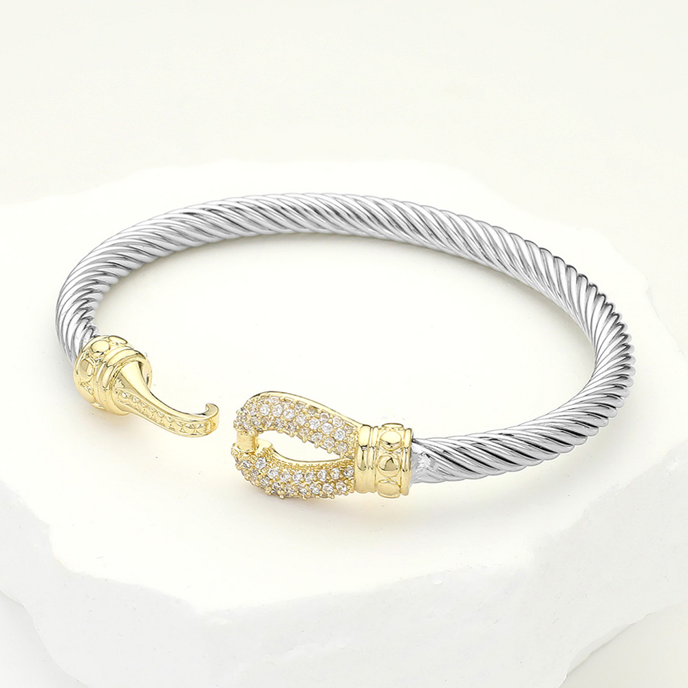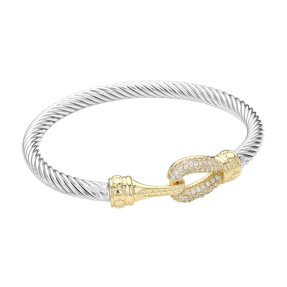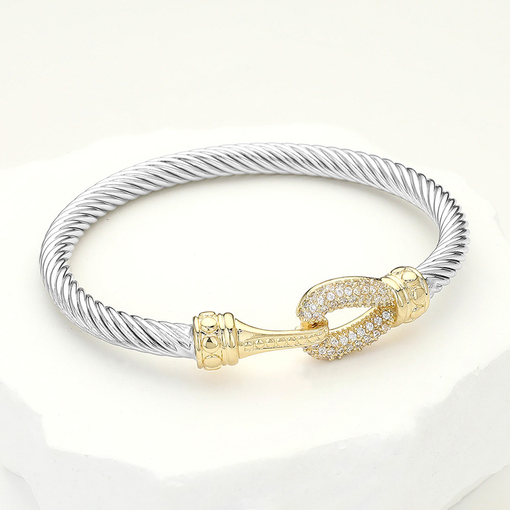 Details • Size : 0.5" H, 2.4" D • Hook Closure • Elegant twist coil bracelet featuring a hook-style clasp adorned with sparkling crystals. A versatile accessory that combines modern design with timeless charm, perfect for stacking or wearing solo. Ideal for casual or formal looks, making it a stylish gift or personal statement piece. • CZ Cubic Zirconia