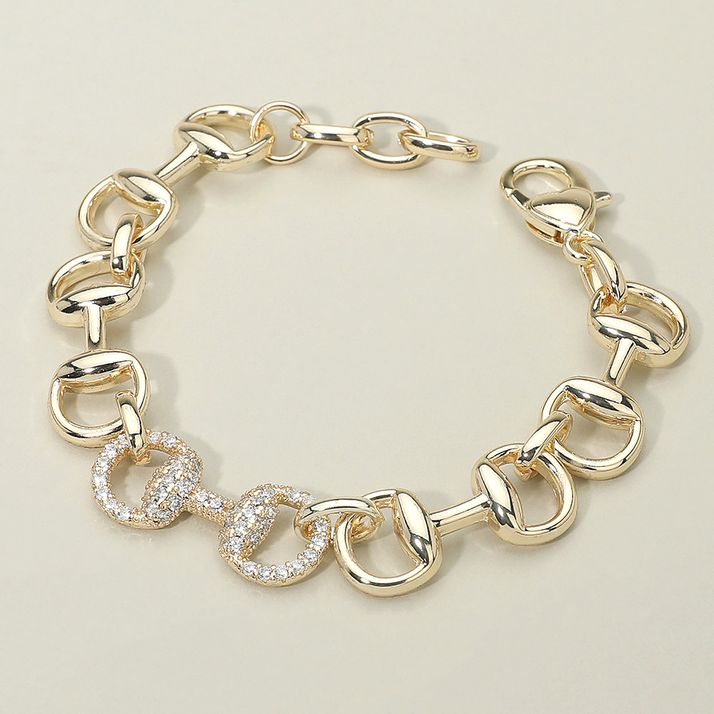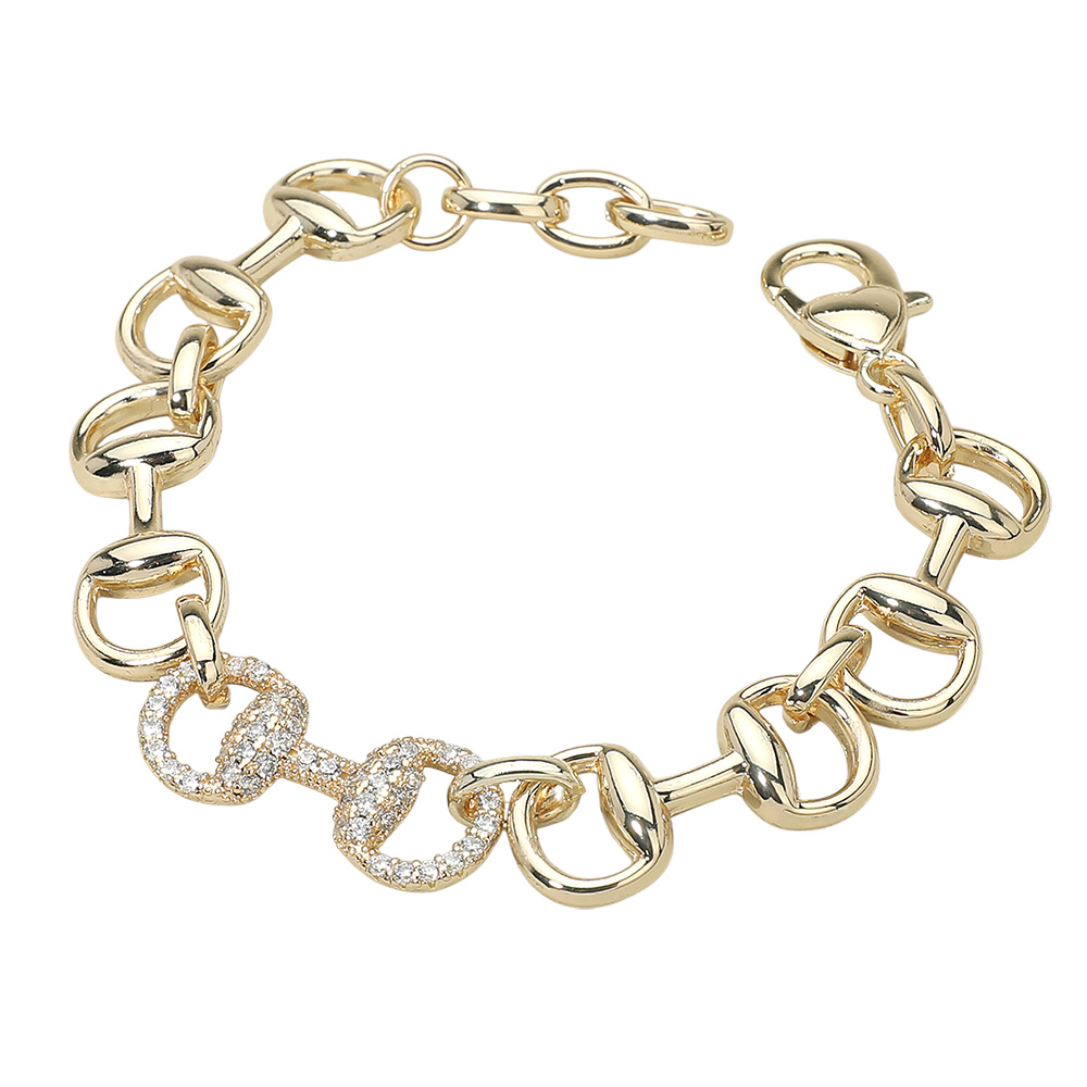 Details • Size : 0.5" H, 7" + 1" L • Lobster Clasp Closure • Stylish chain link bracelet featuring a crystal-accented centerpiece that adds a touch of sparkle to its bold design. Perfect for stacking or wearing solo, this bracelet brings modern sophistication to any look, making it a versatile accessory for casual days or elegant evenings. • CZ Cubic Zirconia • Gold Dipped