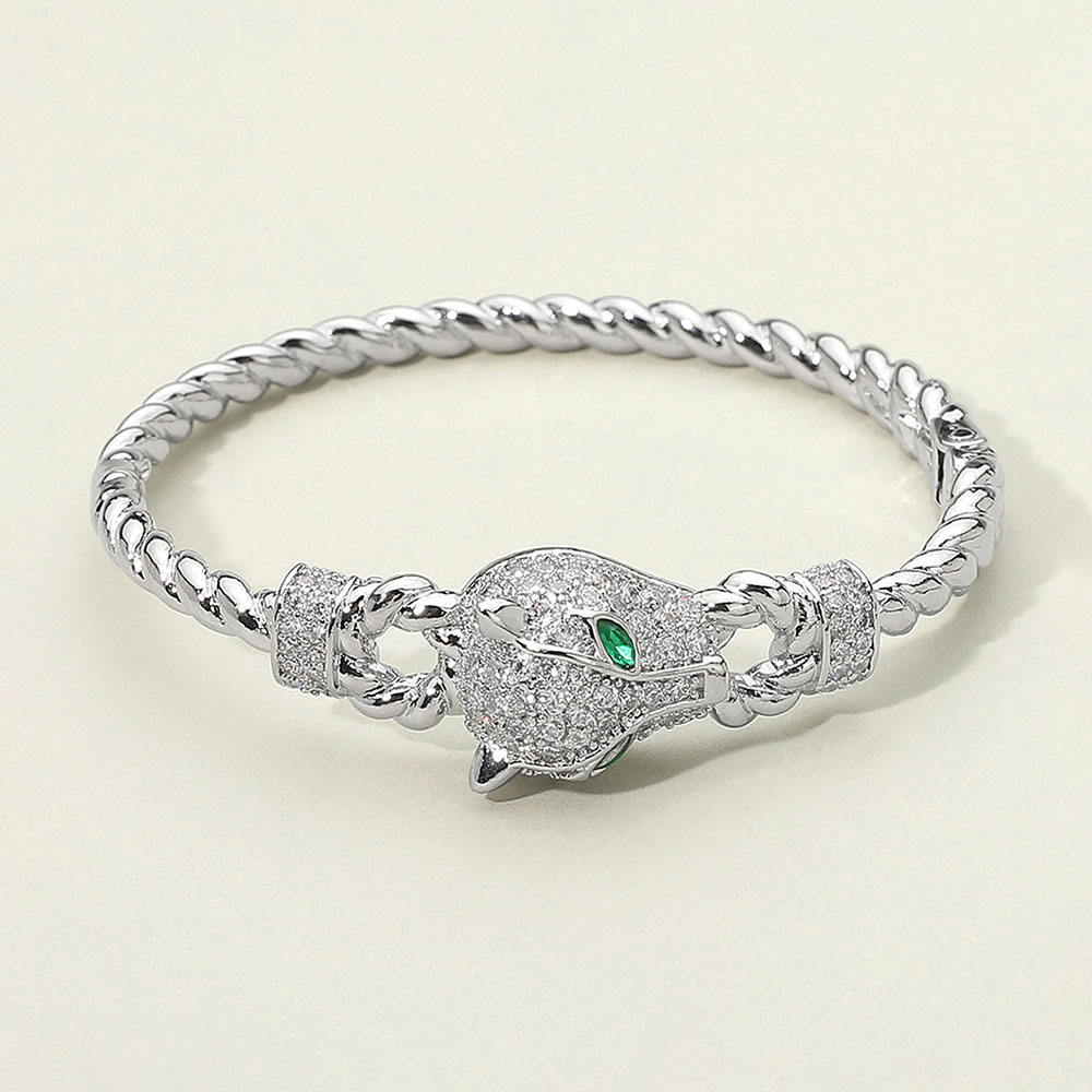 • Embrace bold elegance with this panther head bracelet, showcasing shimmering crystal details and striking green eyes. The twisted band adds a refined touch, while the fierce yet sophisticated design makes it a standout accessory for both everyday wear and glamorous occasions.