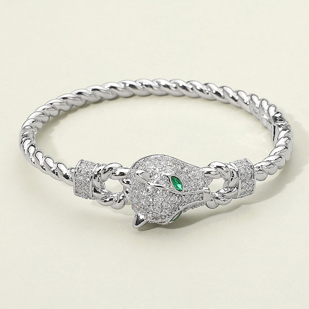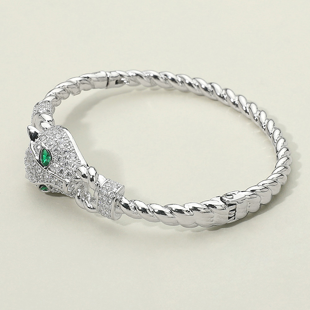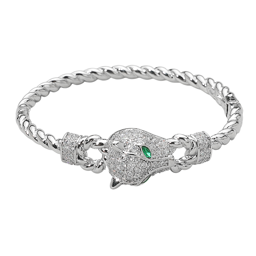 Details • Size : 0.7" H, 2.25" D • Hinged Closure • Embrace bold elegance with this panther head bracelet, showcasing shimmering crystal details and striking green eyes. The twisted band adds a refined touch, while the fierce yet sophisticated design makes it a standout accessory for both everyday wear and glamorous occasions. • CZ Cubic Zirconia