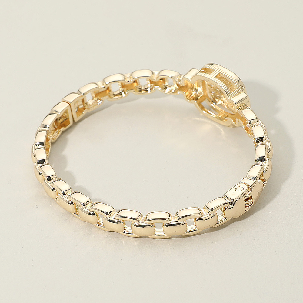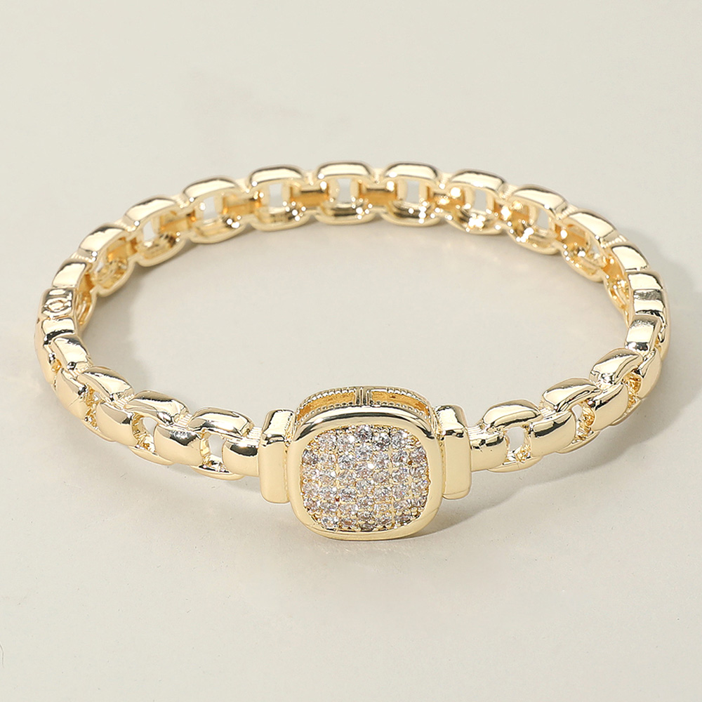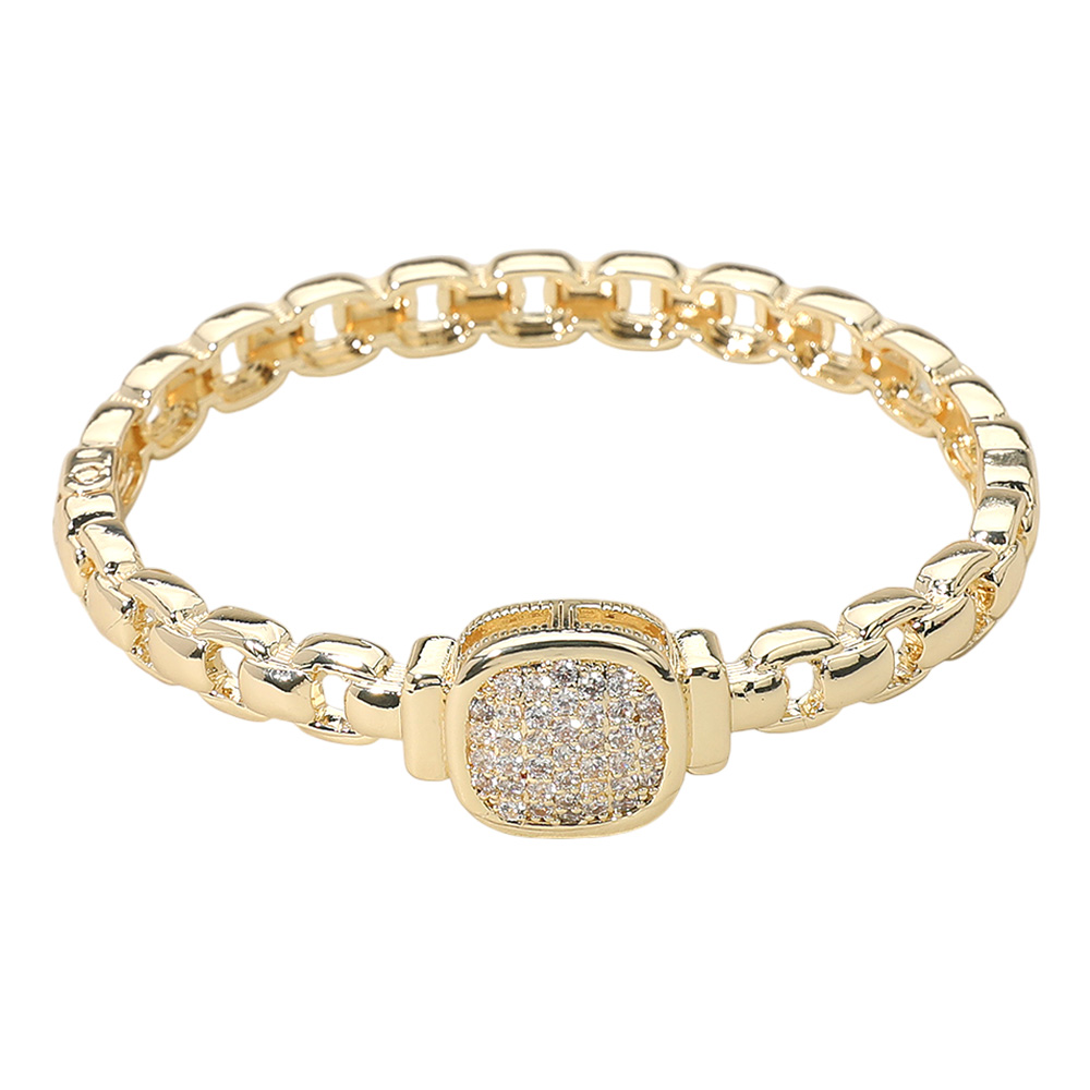 Details • Size : 0.6" H, 2.4" D • Hinged Closure • Sophisticated chain link bangle bracelet designed with a bold square centerpiece adorned in shimmering crystals. A modern statement accessory that adds refined sparkle, perfect for elevating both casual and formal looks. • CZ Cubic Zirconia