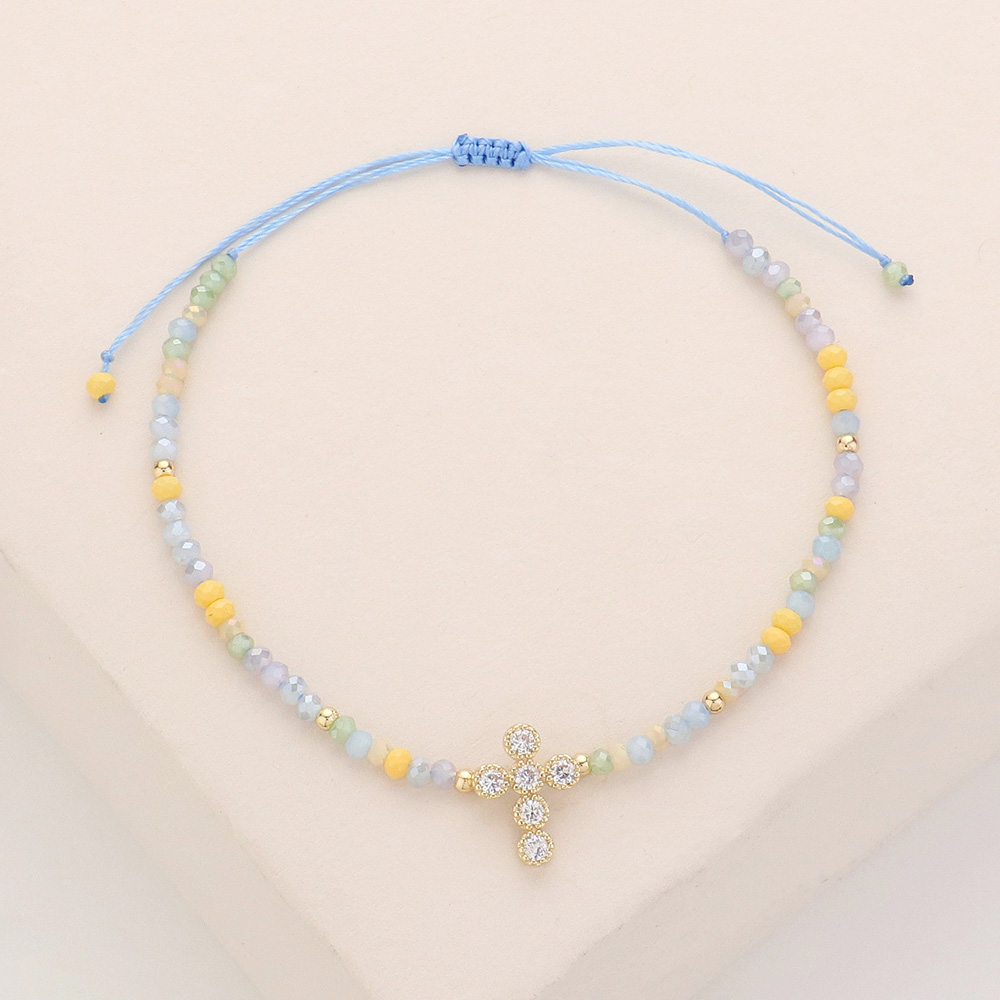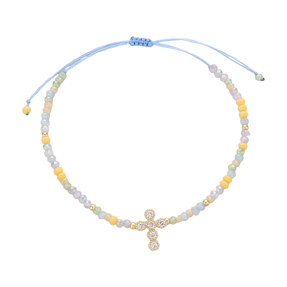 CZ Stone Pointed Cross Pendant Faceted Beaded Cinch Pull Tie Bracelet