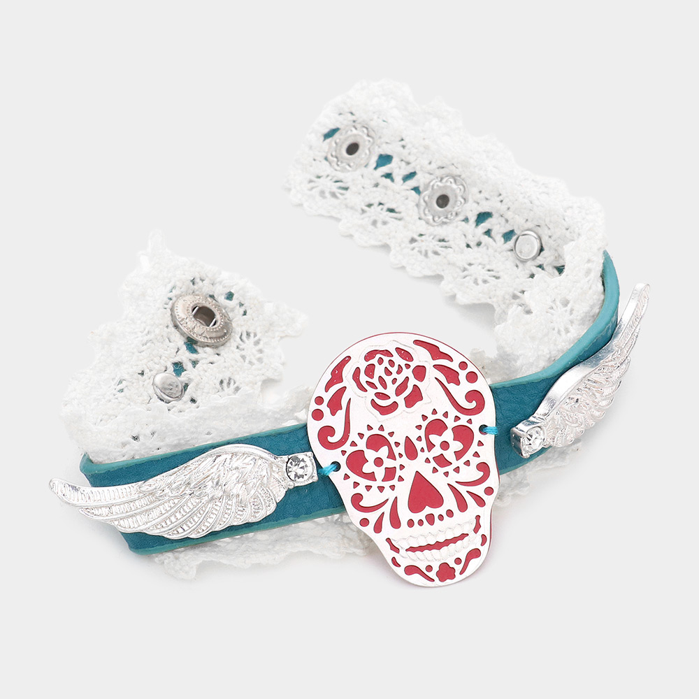 Day of the Dead Skull Wings Lace Faux Leather Bracelet