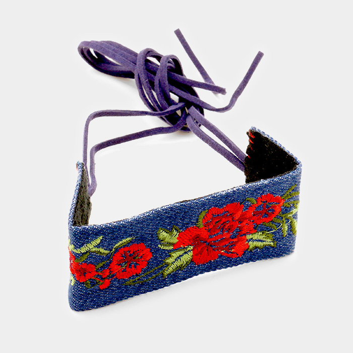 Fabric Embroidery Flower with Suede Wrap Bracelet