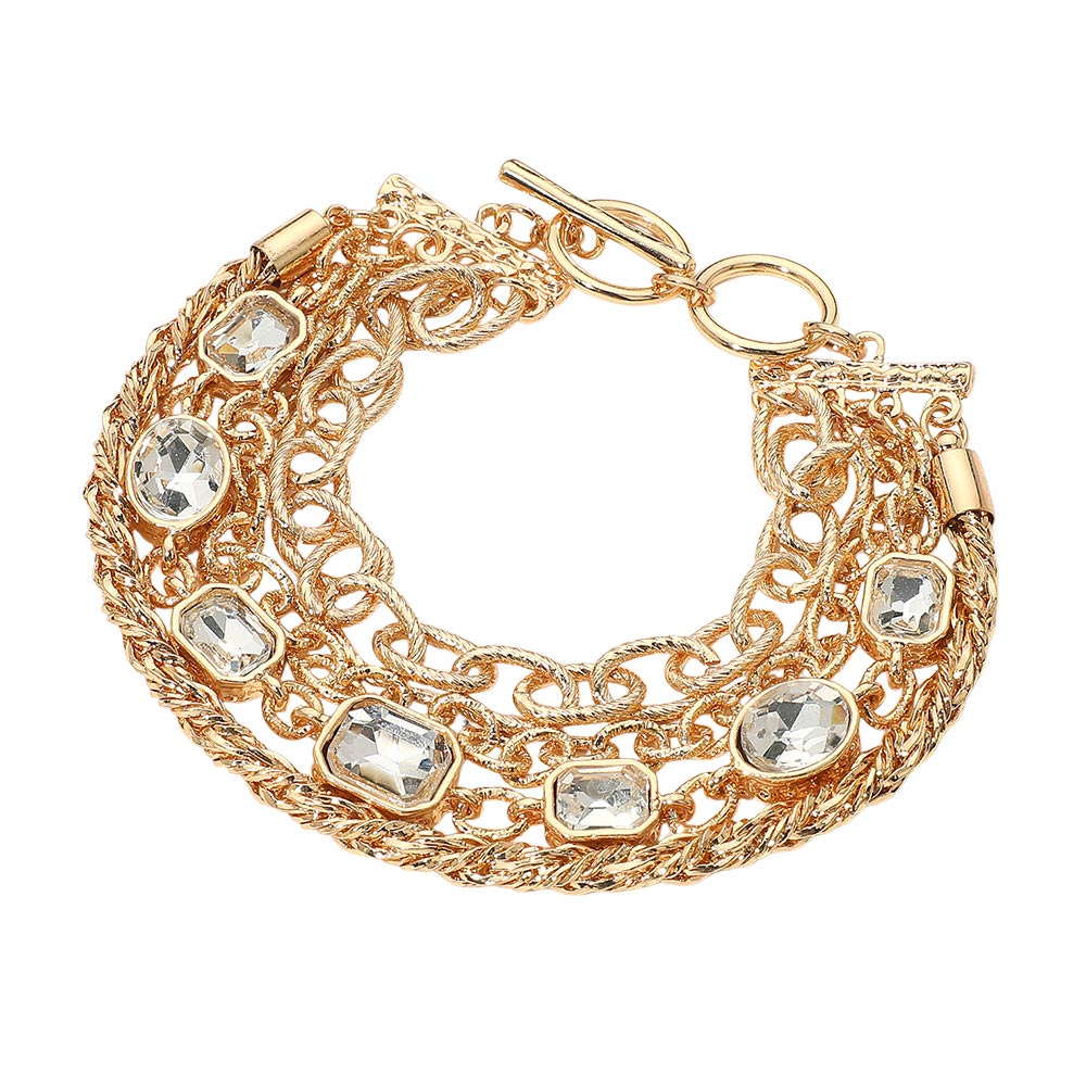 Details • Size : 1" H, 7.75" + 1.25" L • Lobster Clasp Closure • Layered chain bracelet featuring sparkling faceted stones and an intricate mix of textures. This statement piece adds elegance and shine to any outfit, secured with a classic toggle clasp for easy wear and a refined look. • Lead and Nickel Compliant