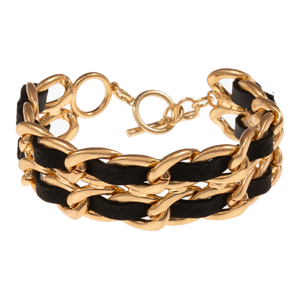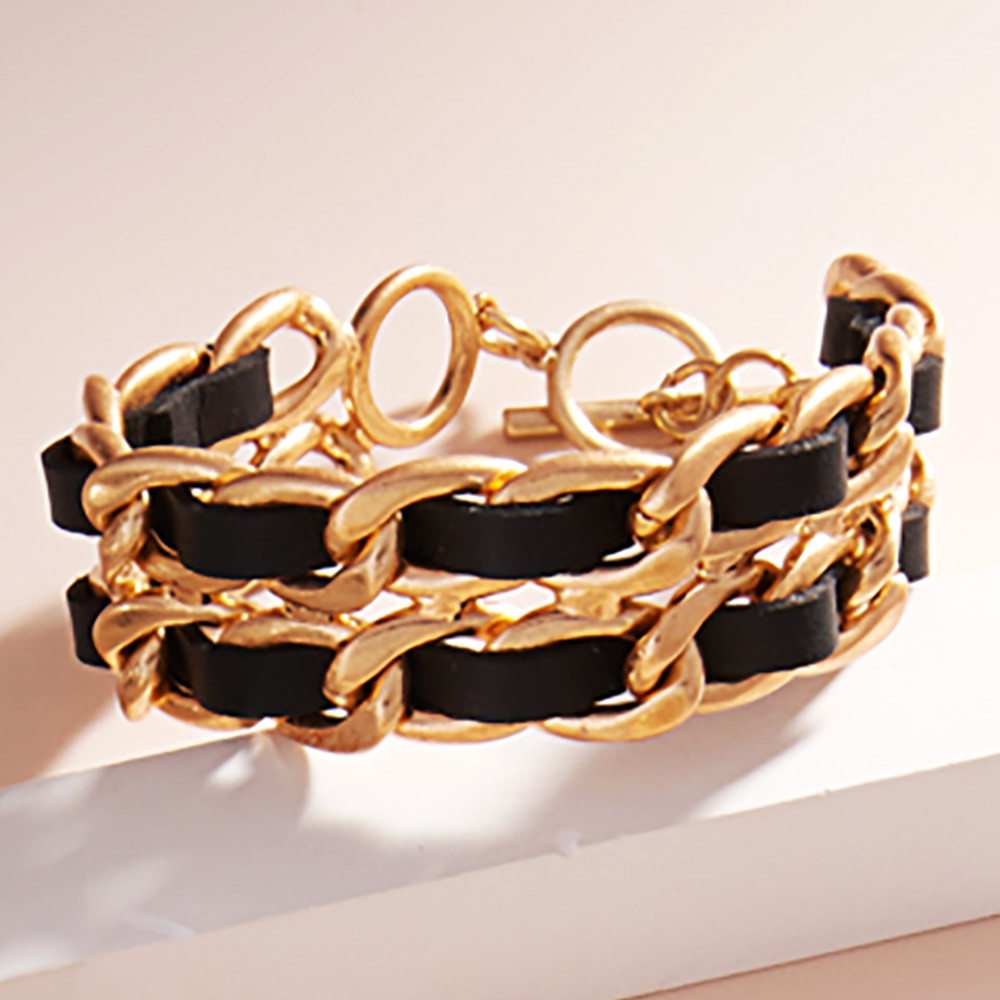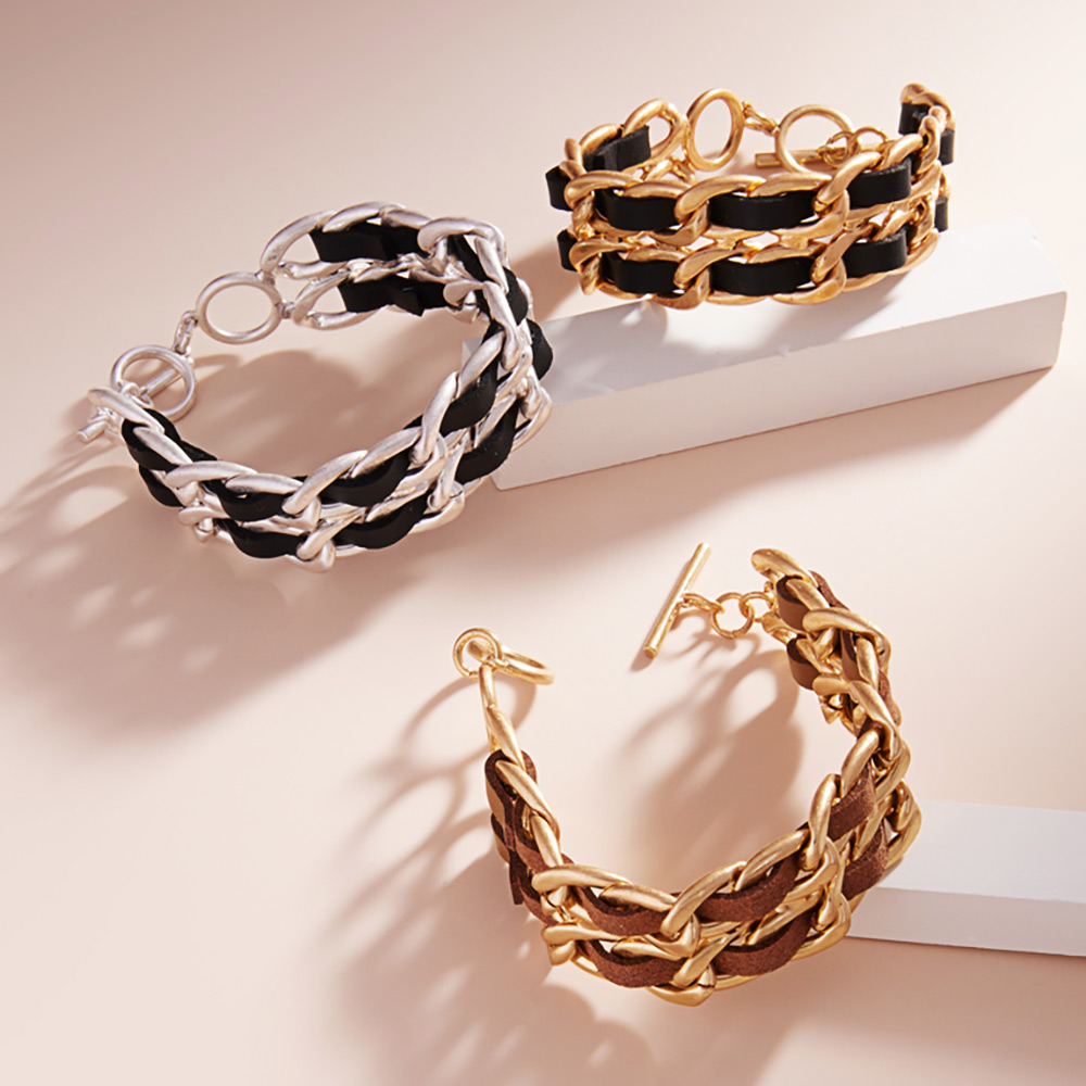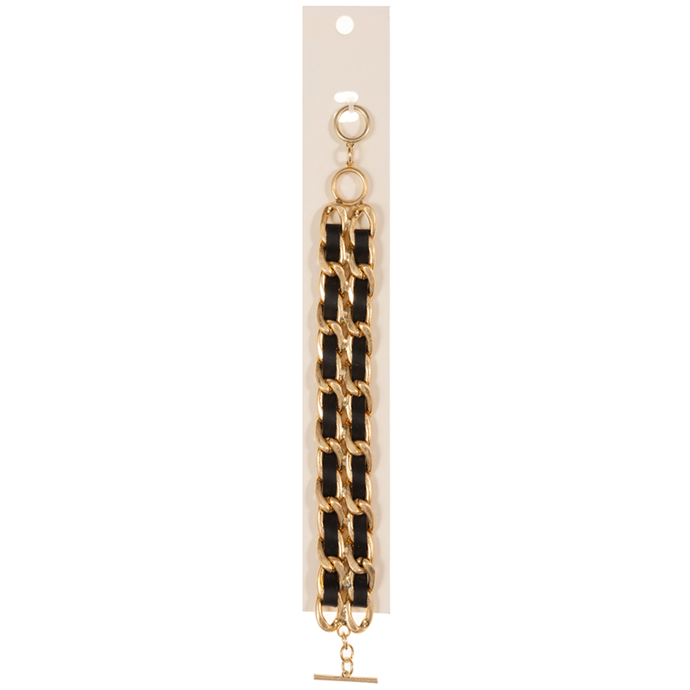 Details • Size : 0.9" H, 7.5" + 0.25" L • Toggle Closure • Bold double chain bracelet featuring thick interlocking links and a sleek woven insert for contrast. Designed with a toggle clasp for secure fit and modern style, perfect for elevating everyday or evening looks. • Lead and Nickel Compliant