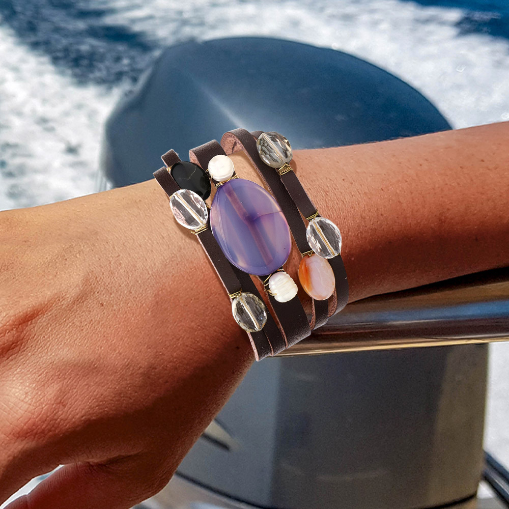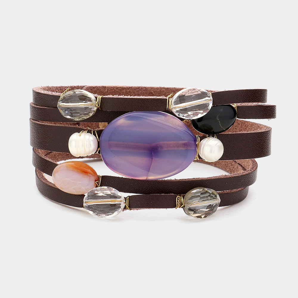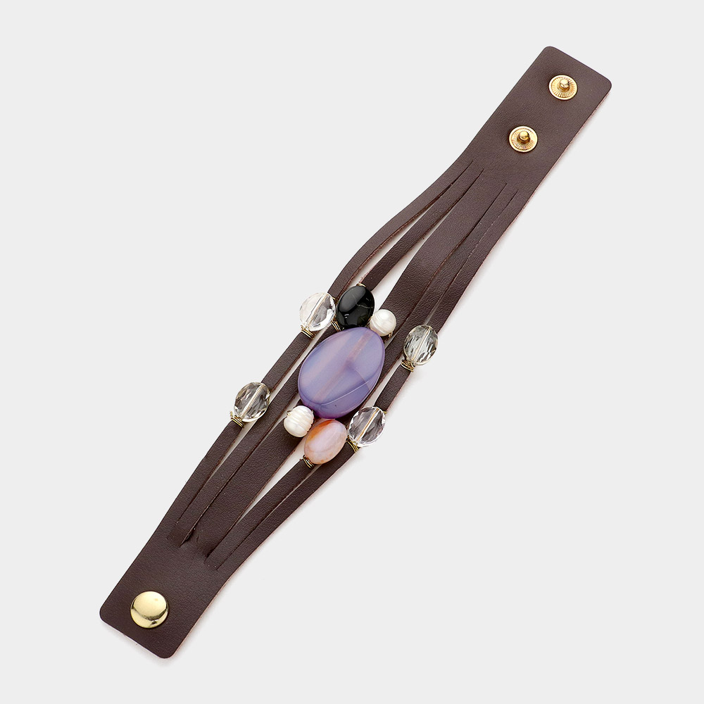 Details • Size : 1.5" H, 7" + 1" L • Snap Closure • This striking multi-strand bracelet features layered bands adorned with polished and faceted gem-like accents. Designed for bold, fashion-forward style, it adds texture and sparkle to any outfit—perfect for beach days, travel, or casual-chic ensembles. • Lead and Nickel Compliant
