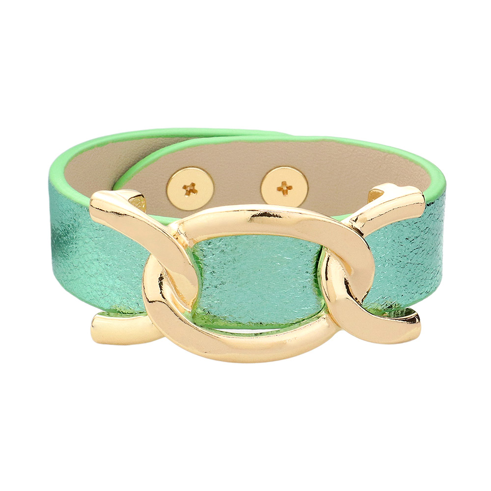 Faux Sparkle Leather Metal Link Accented Snap Bracelet
