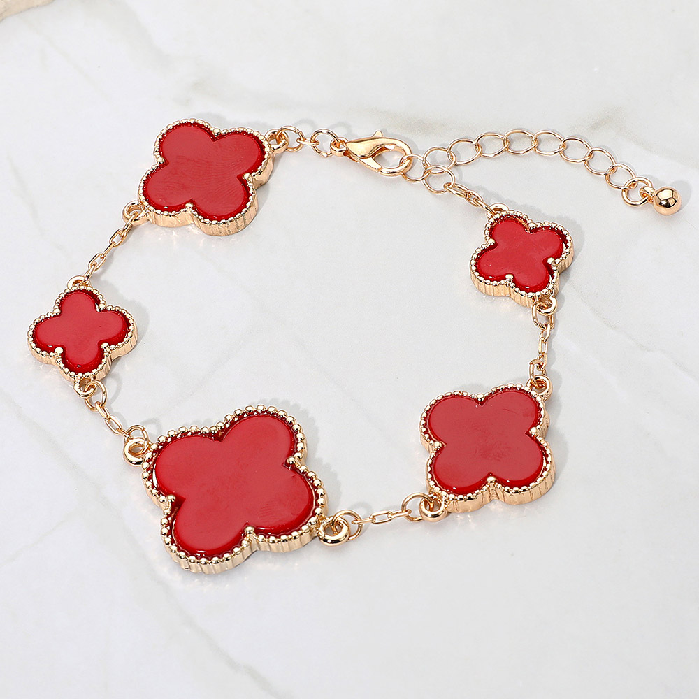 • Chic bracelet featuring five quatrefoil-shaped charms linked along a sleek gold chain. With a mix of small and large motifs, it adds elegance and versatility to any outfit. Perfect for layering or wearing solo, this timeless accessory complements both casual and formal looks effortlessly.