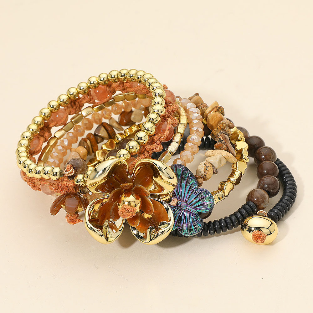 Details • Size : 2.5" H, 2.4" D • Adjustable • Multi-layer bracelet stack featuring mixed beads, textured details and a bold floral charm centerpiece. Adjustable and easy to style, it adds boho-inspired elegance to casual or dressy outfits. A vibrant accessory with rich dimension and standout personality. • Lead and Nickel Compliant