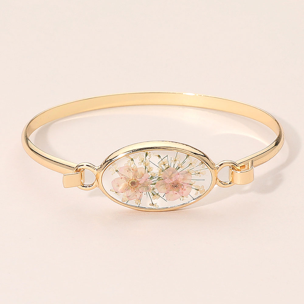 Details • Size : 0.7" H, 2.4" D • Hook Closure • Elevate everyday style with this Floral Encased Oval Bangle Bracelet, featuring a delicate preserved-flower centerpiece inside a sleek oval frame. Designed for comfortable wear and easy layering, it adds a refined, nature-inspired accent to casual looks, work outfits, or special occasions and makes a thoughtful gift choice. • Lead and Nickel Compliant