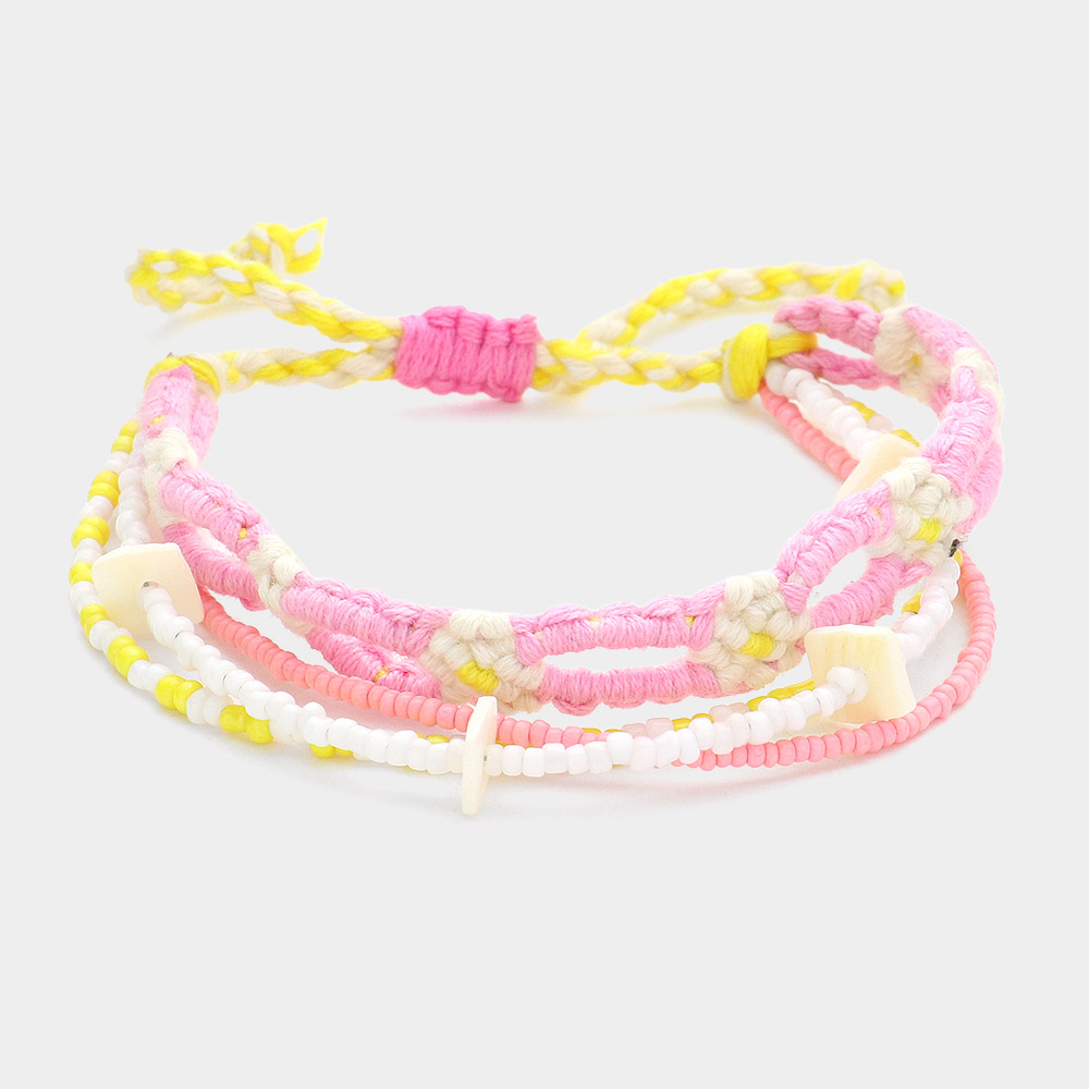 Flower Threaded Shell Piece Pointed Beaded Adjustable Cinch Pull Tie Bracelet