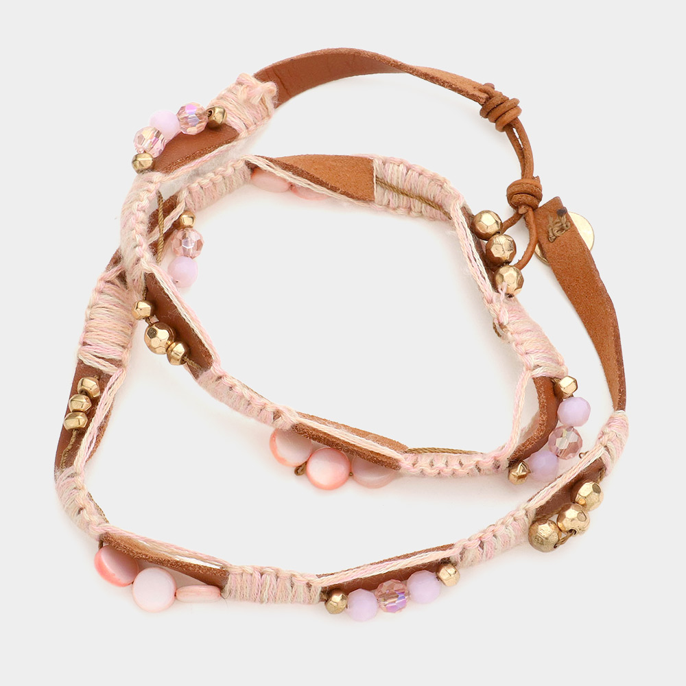 Glass beads mother of pearl threaded faux leather wrap bracelet