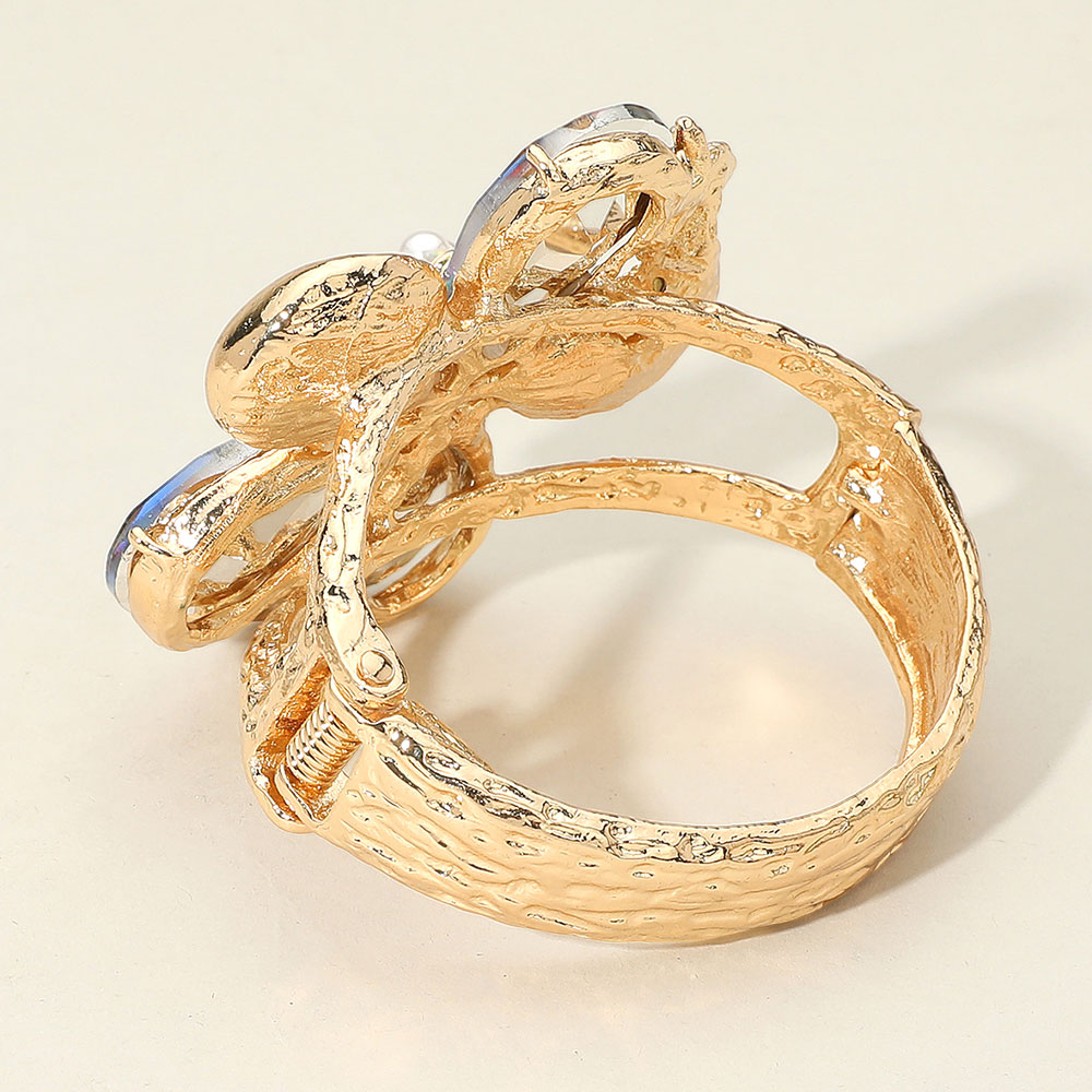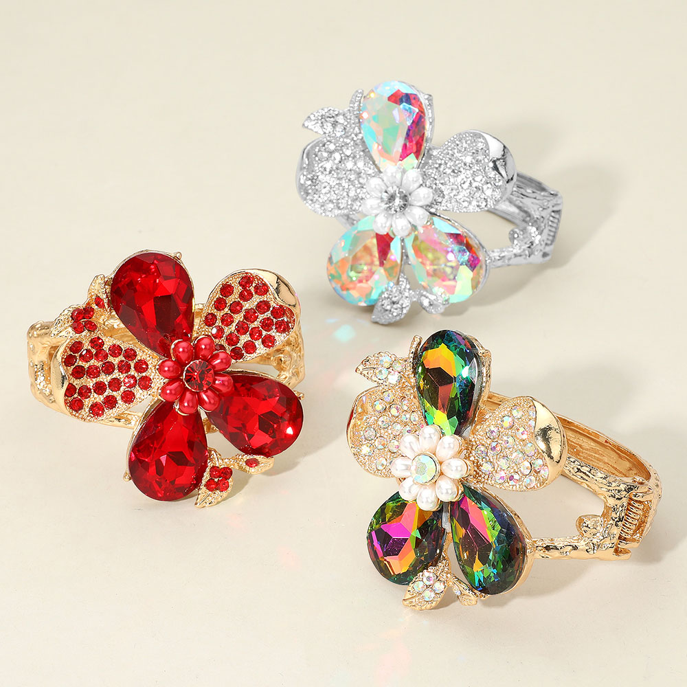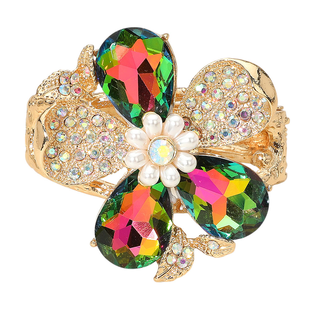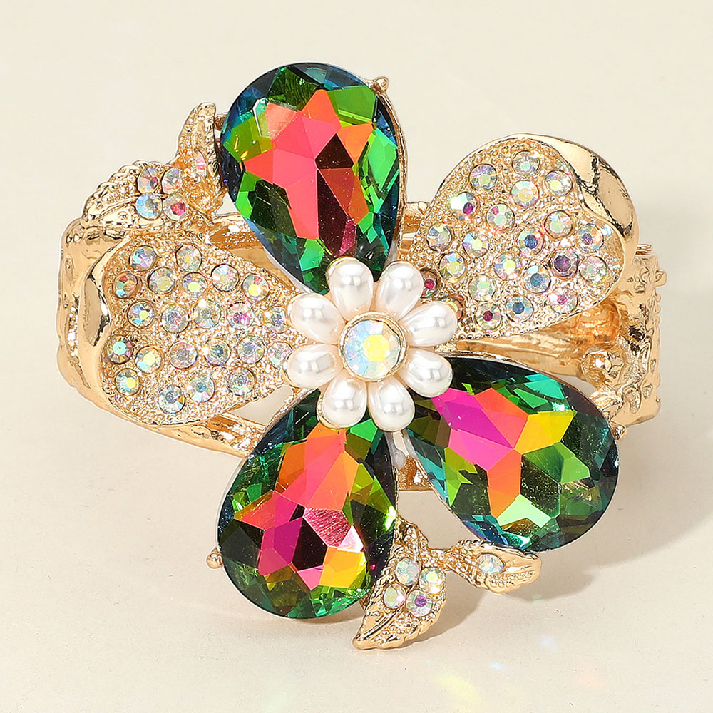 Glass Stone Pearl Embellished Flower Hinged Bangle Bracelet