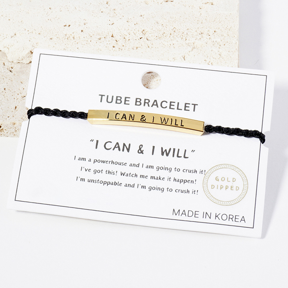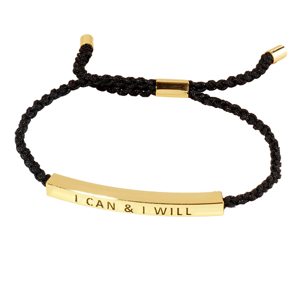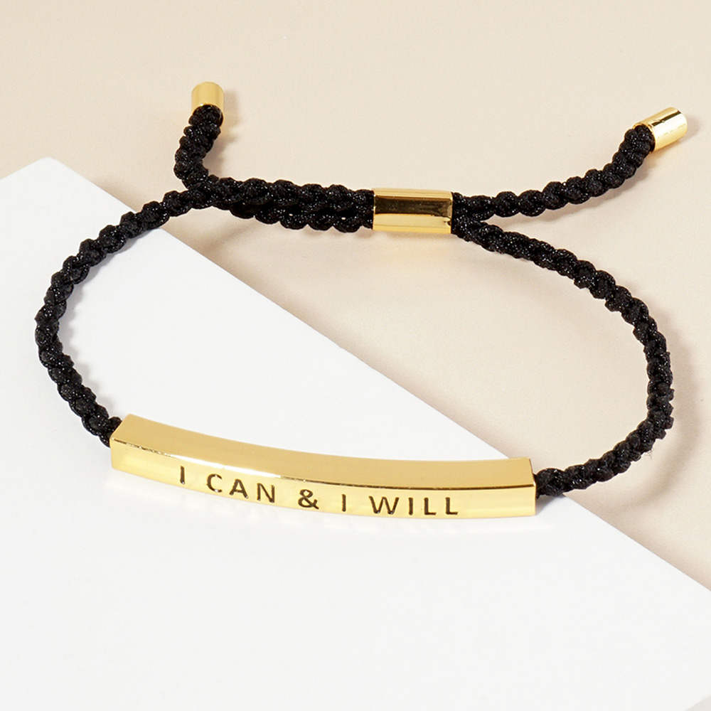 White Gold Dipped I CAN I WILL Message Bar Pointed Rope Adjustable Cinch Pull Tie Bracelet