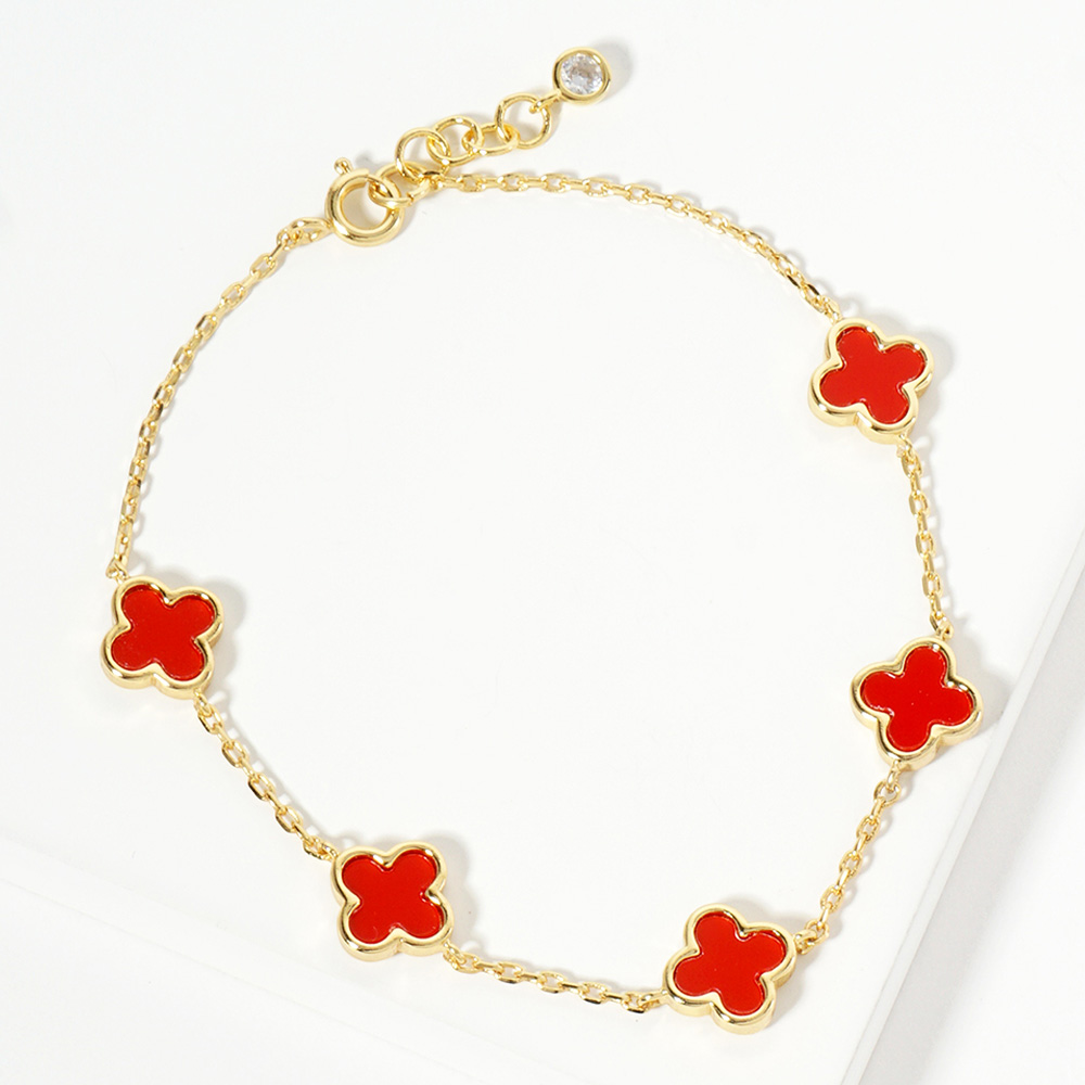 Details • Size : 0.3" H, 7" + 0.75" L • Lobster Clasp Closure • Elevate your look with this stylish link bracelet featuring five clover-shaped charms and a sleek finish. The delicate chain design and secure clasp make it perfect for layering or wearing solo. A charming addition to any jewelry collection, ideal for everyday elegance or gifting. • Lead and Nickel Compliant • Made In Korea • Gold Dipped