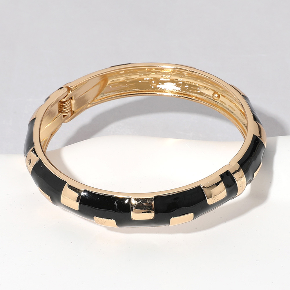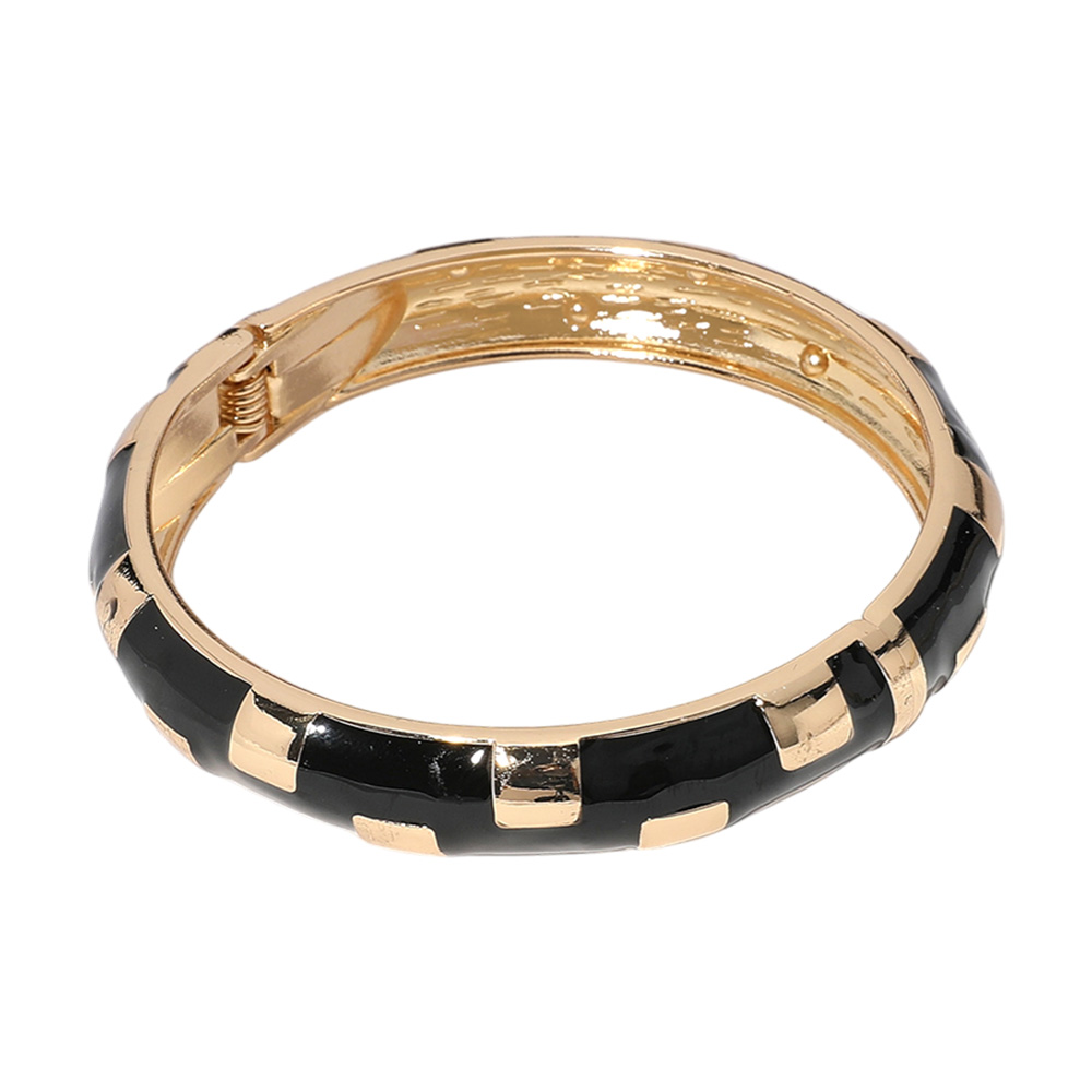 Details • Size : 0.5" H, 2.4" D • Hinged Closure • Elevate your jewelry collection with this patterned hinged bangle bracelet. Featuring a bold geometric design and secure closure, it adds a touch of sophistication and charm, perfect for wearing alone or stacking with other favorites. • Lead and Nickel Compliant • Gold Dipped
