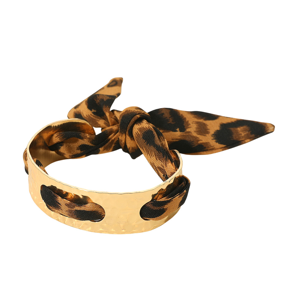 Details • Size : 0.8" H, 2.6" D • Adjustable • Chic hammered bracelet featuring a sleek band woven with animal print fabric and finished with a tie accent. A fashionable accessory that blends edgy design with playful flair, perfect for adding a bold touch to both casual and dressy outfits. • Lead and Nickel Compliant