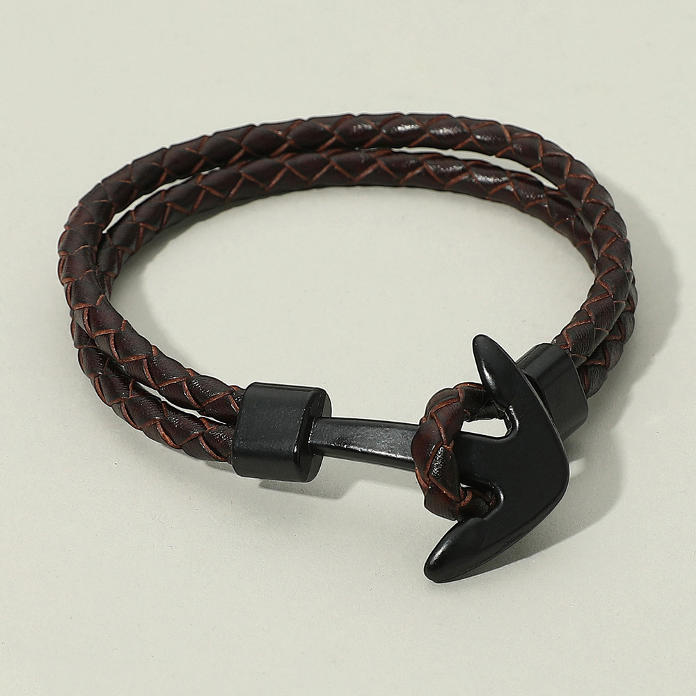 Mens Genuine Leather Braided Anchor Clasp Bracelet
