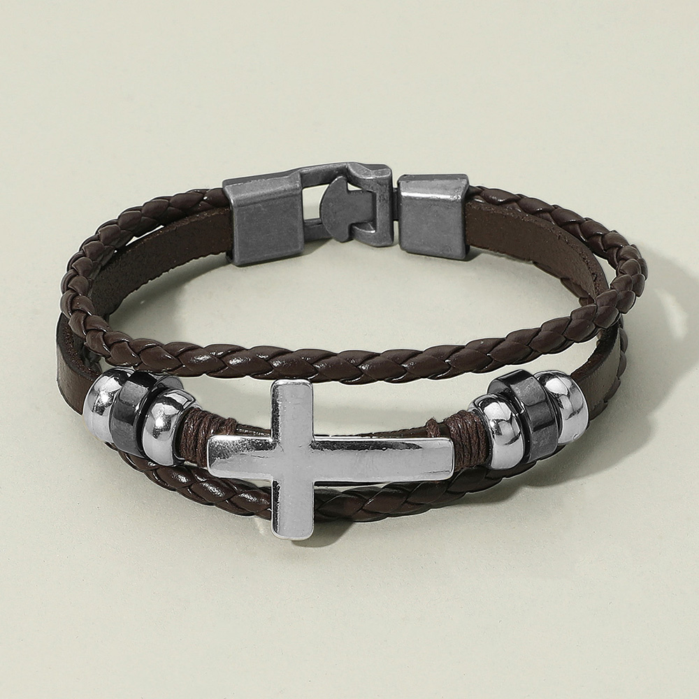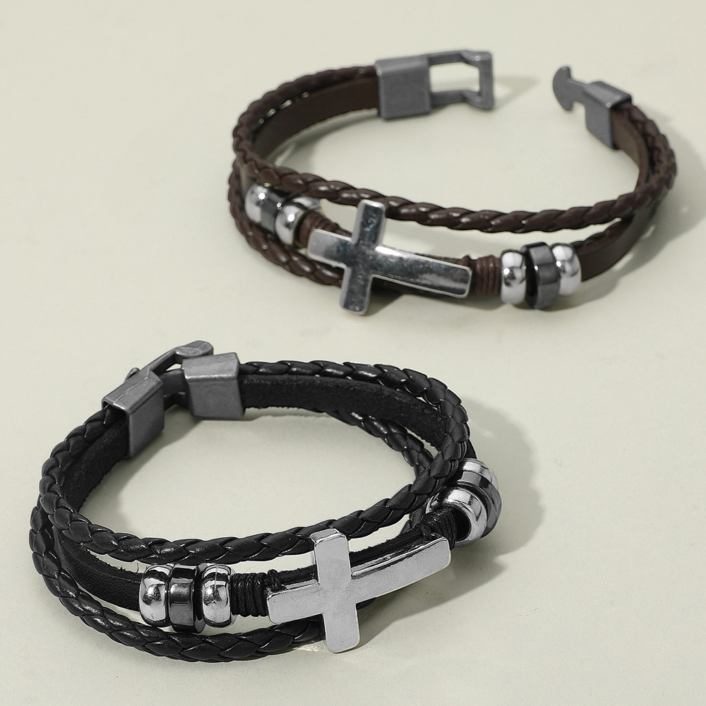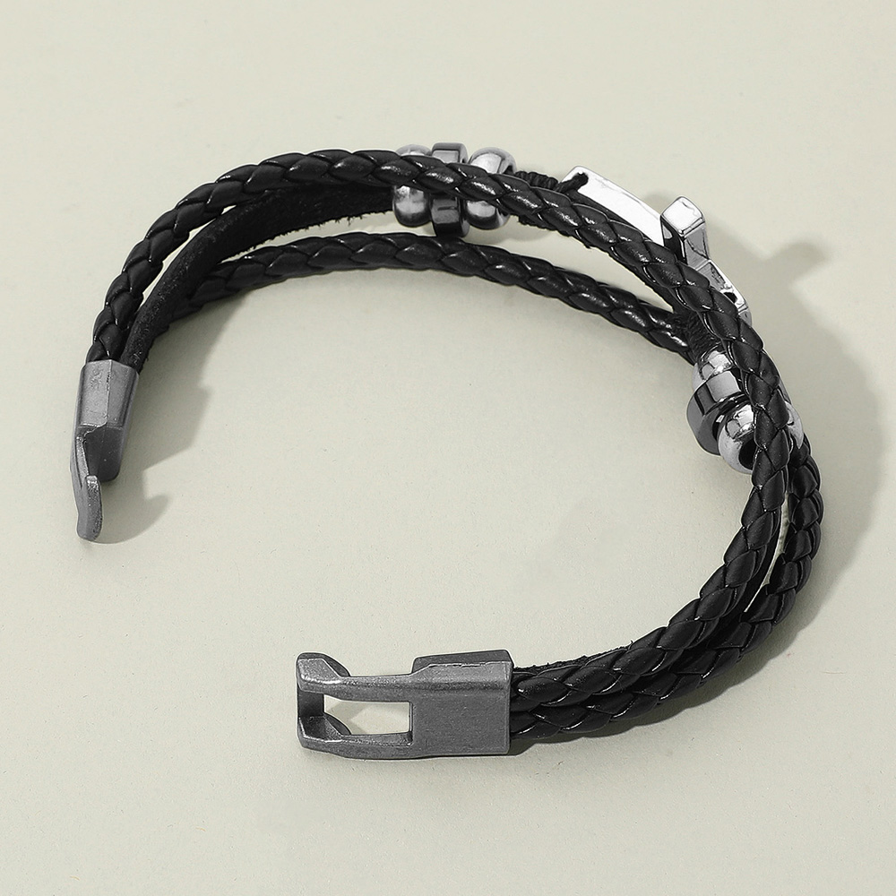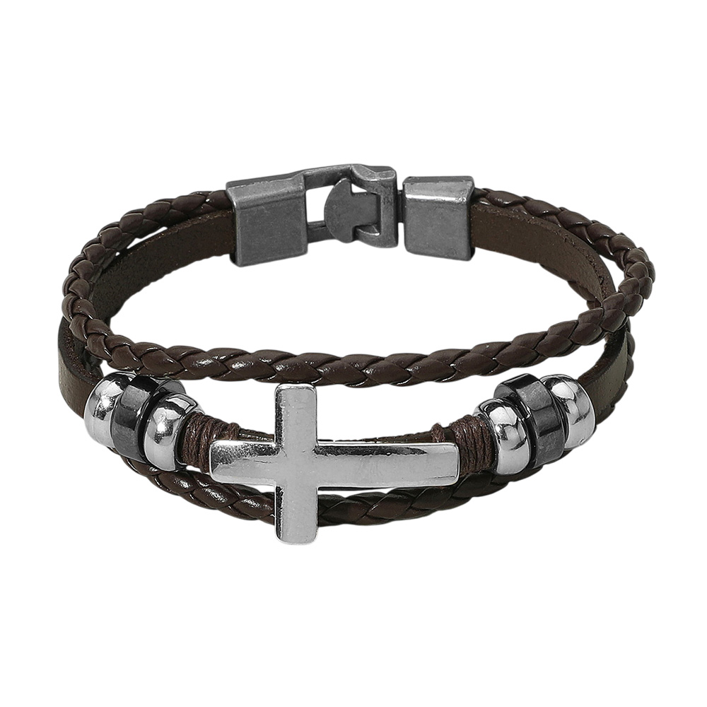 Details • Size : 1" H, 7.75" + 0.75" L • Genuine Leather • Clasp Closure • This braided leather bracelet features a sleek cross centerpiece and polished metal bead accents, creating a bold and stylish look. With a secure clasp and comfortable fit, it’s a versatile accessory for adding a modern edge to any outfit. • Lead and Nickel Compliant