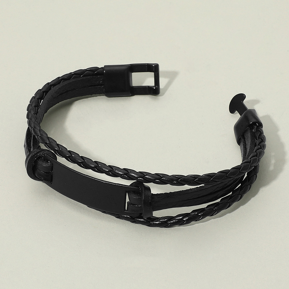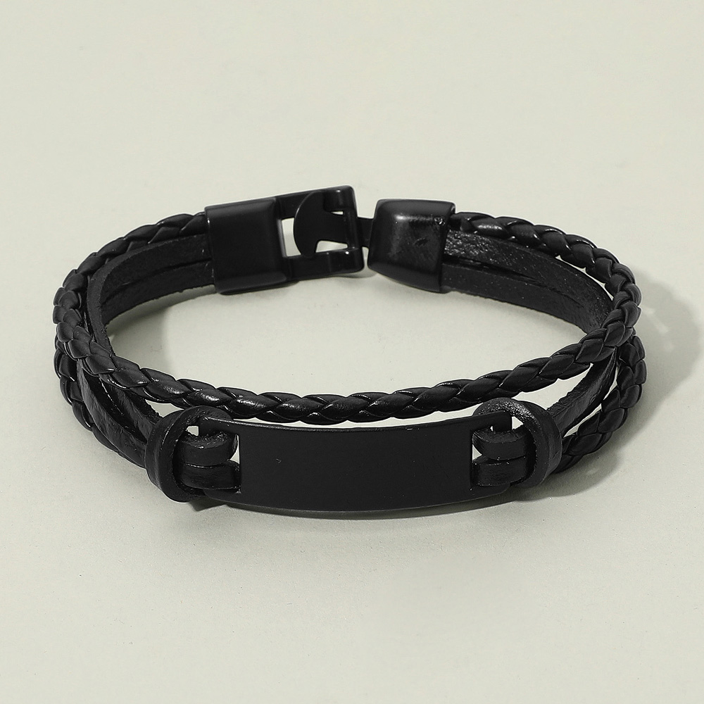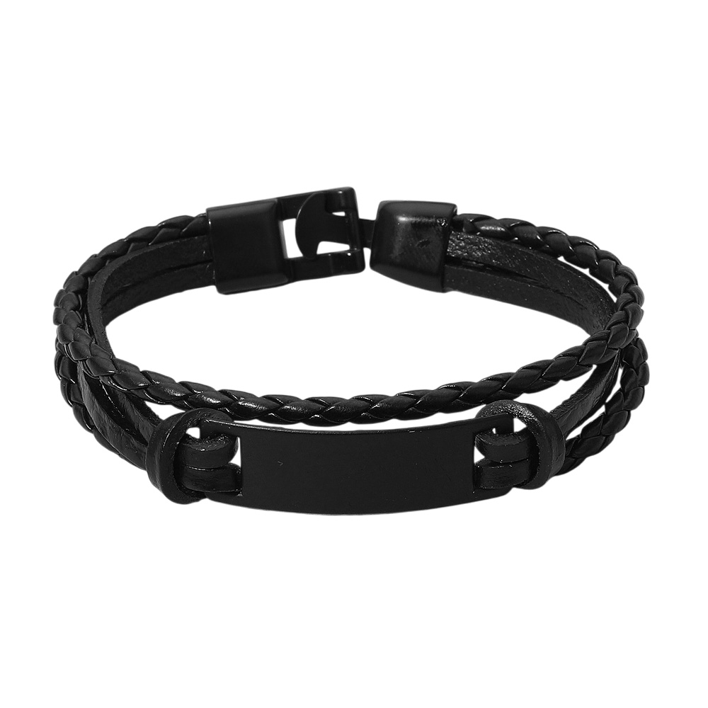 Details • Size : 0.8" H, 7.5" + 0.75" L • Genuine Leather • Hook Closure • This braided leather bracelet features a sleek, minimalist plate centerpiece for a clean, modern aesthetic. Designed with comfort and durability in mind, it’s a versatile accessory that adds subtle sophistication to both casual and smart outfits. • Lead and Nickel Compliant