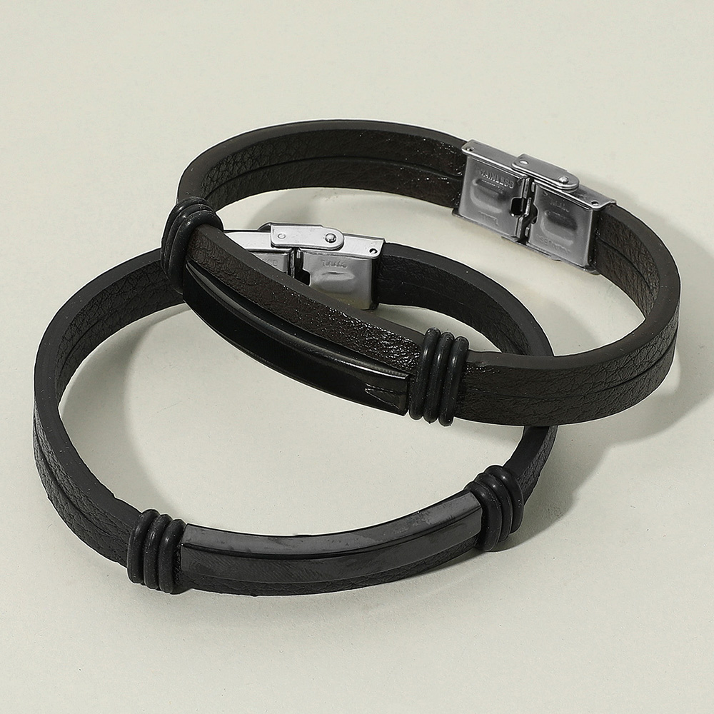 Details • Size : 0.6" H, 8" + 0.5" L • Genuine Leather • Clasp Closure • This sleek leather bracelet features a polished metal plate accent and a secure clasp closure for a refined, modern look. Comfortable and durable, it’s a versatile accessory that complements casual, business, and evening styles effortlessly. • Lead and Nickel Compliant