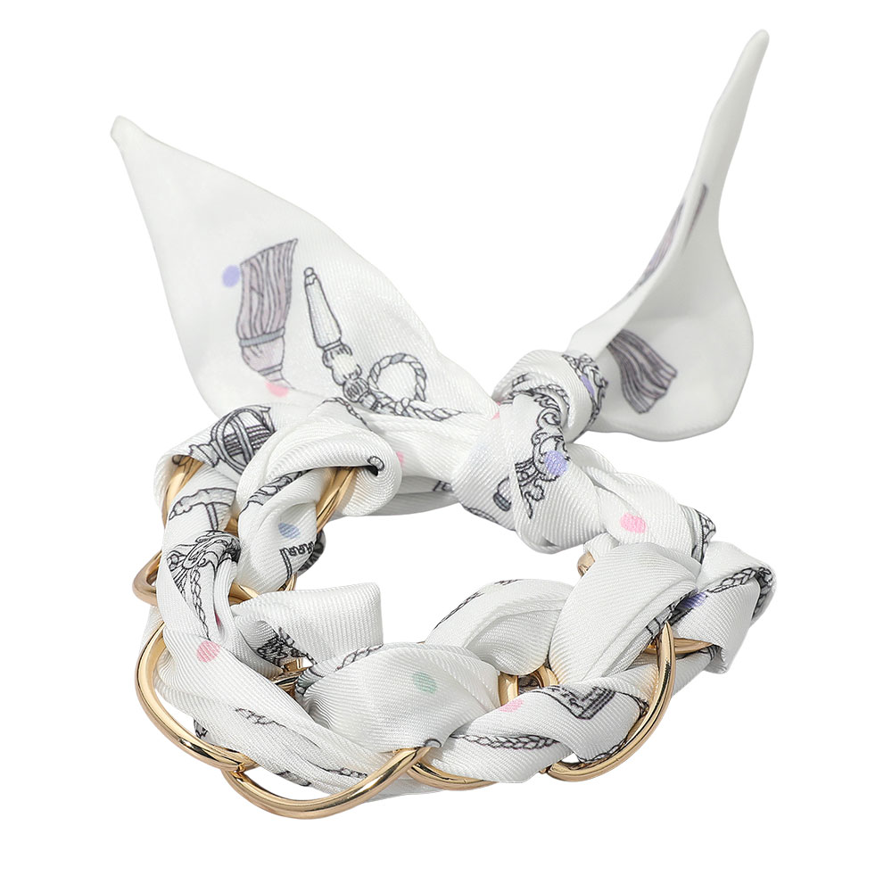 • Elevate your style with this adjustable scarf bracelet featuring interlinked metallic rings wrapped in a patterned fabric tie. Its unique design combines bold details with a chic finish, making it a versatile accessory for casual looks or standout statement wear.