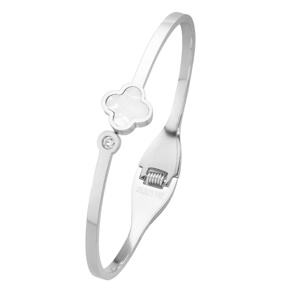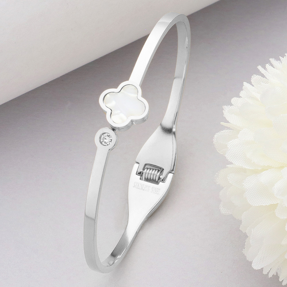 Mother Of Pearl Quatrefoil Pointed Stainless Steel Hinged Bangle Bracelet
