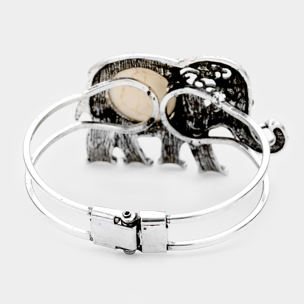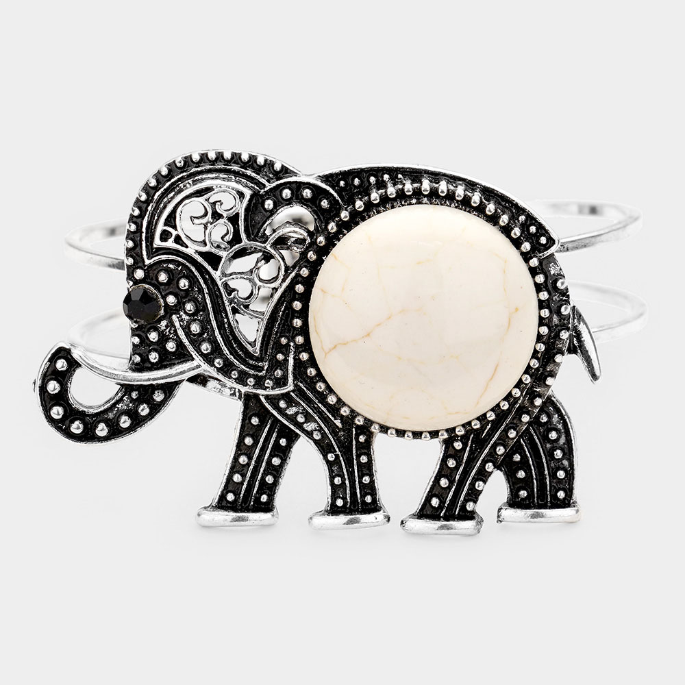 Details • Size : 1.5" H, 2.4" D • Hinged Closure • Add charm and character to your style with this elephant cuff bracelet featuring an ornate design and a bold stone centerpiece. Symbolizing strength and wisdom, it’s a unique accessory that blends cultural inspiration with timeless elegance for everyday or special wear. • Lead and Nickel Compliant
