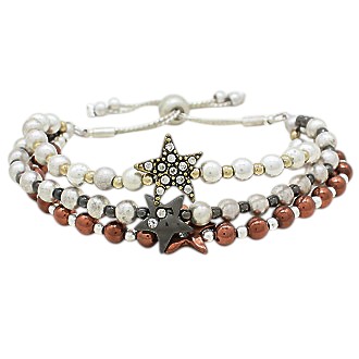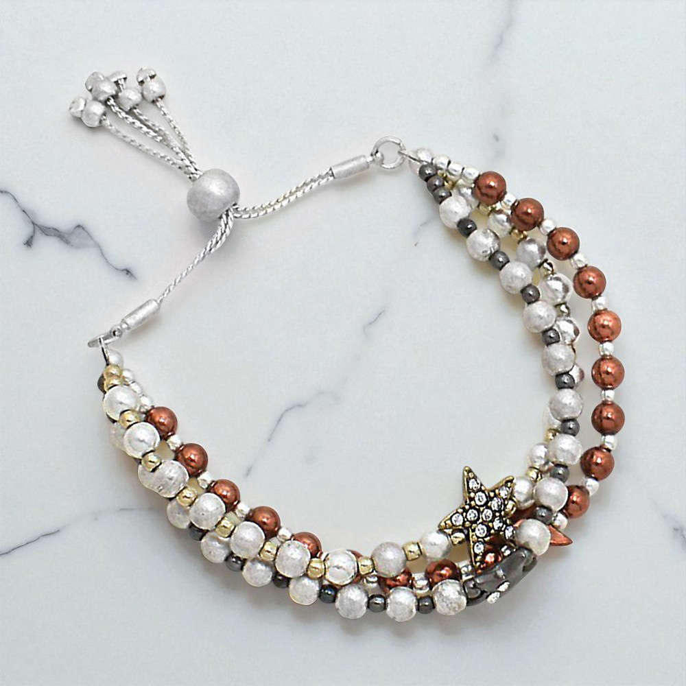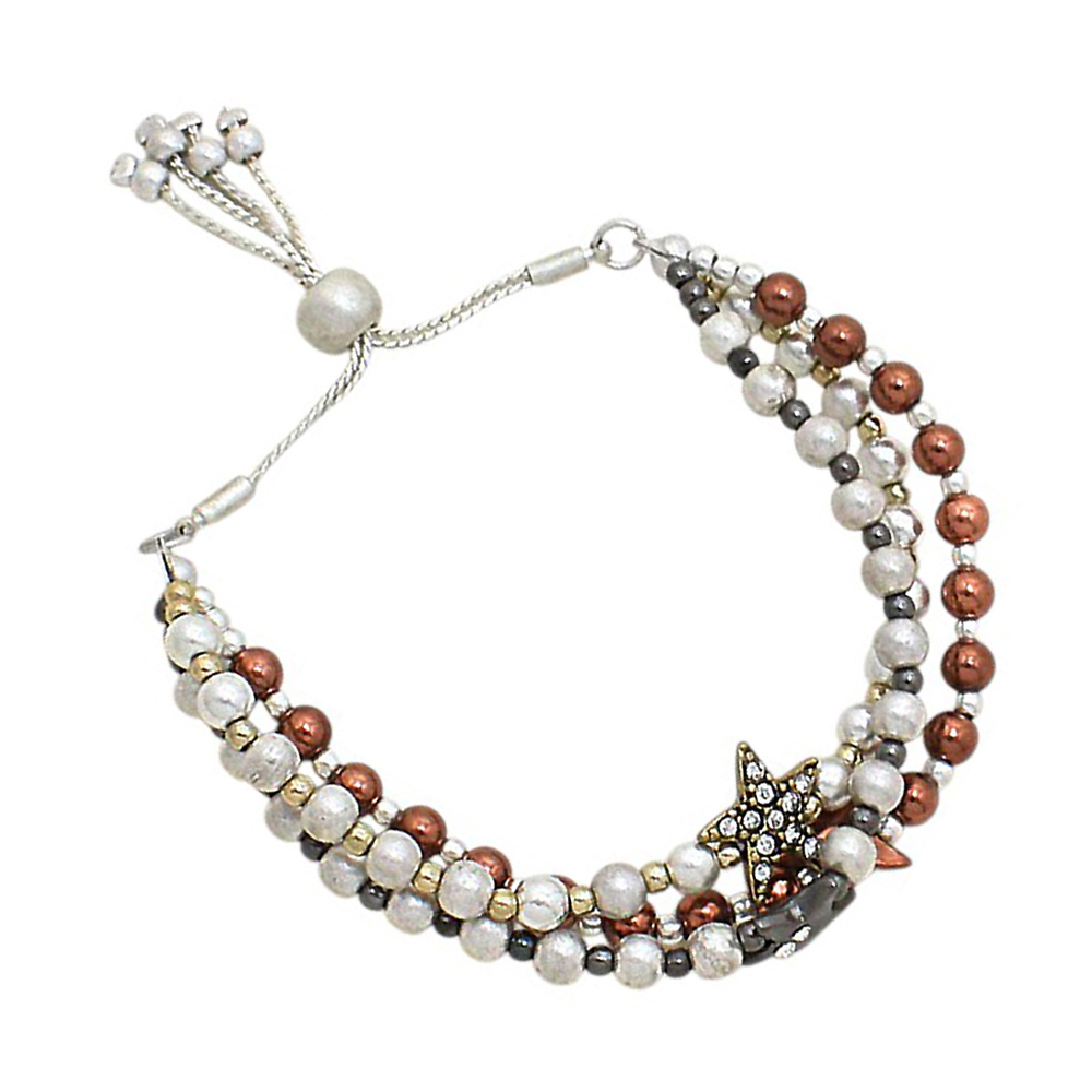 Stone Paved Star Pointed Beaded Triple Layered Pull Tie Cinch Bracelet