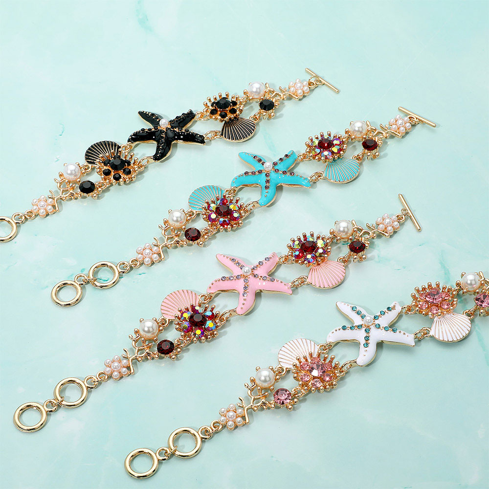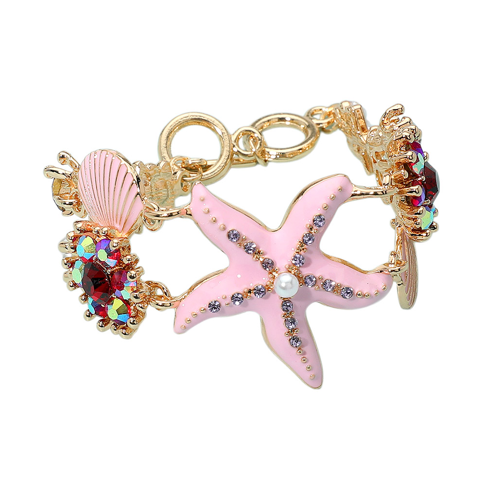 Details • Size : 1.5" H, 7" + 1" L • Toggle Closure • Chic starfish charm bracelet adorned with shells, pearls, and coral-inspired accents. Perfect accessory for a beach look or summer outfit. Adjustable and fashionable design. • Lead and Nickel Compliant