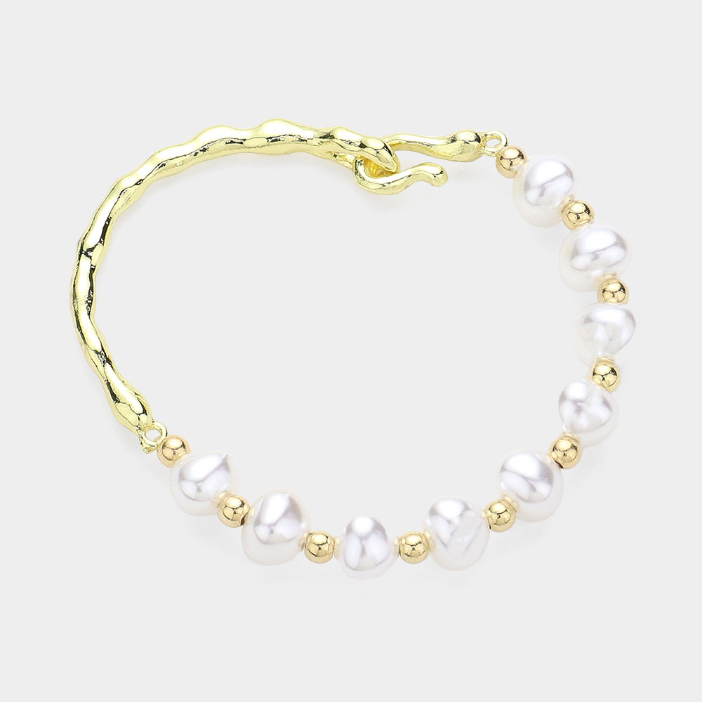 CZ Stone Paved Crisscross Bar Pearl Tip Bubble Cuff Bracelet