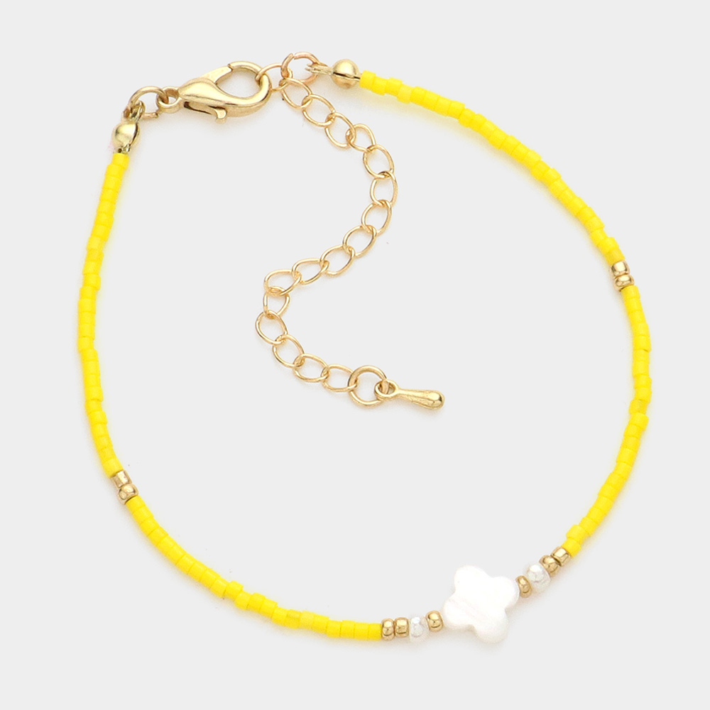 14K Gold Plated CZ Stone Embellished Mother Of Pearl Quatrefoil Charm Textured Metal Toggle Bracelet
