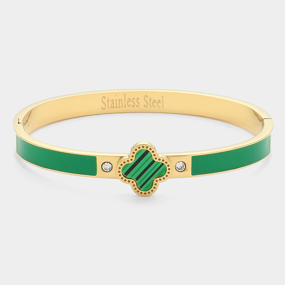 • Chic stainless steel bangle featuring a clover centerpiece flanked by shimmering crystal accents. Designed with a polished finish and secure hinged clasp, it’s a refined statement for any occasion.