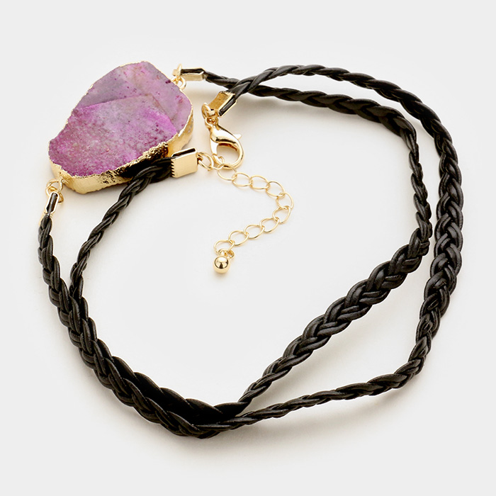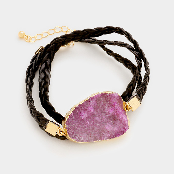 Raw druzy slice & twisted faux leather wrap bracelet