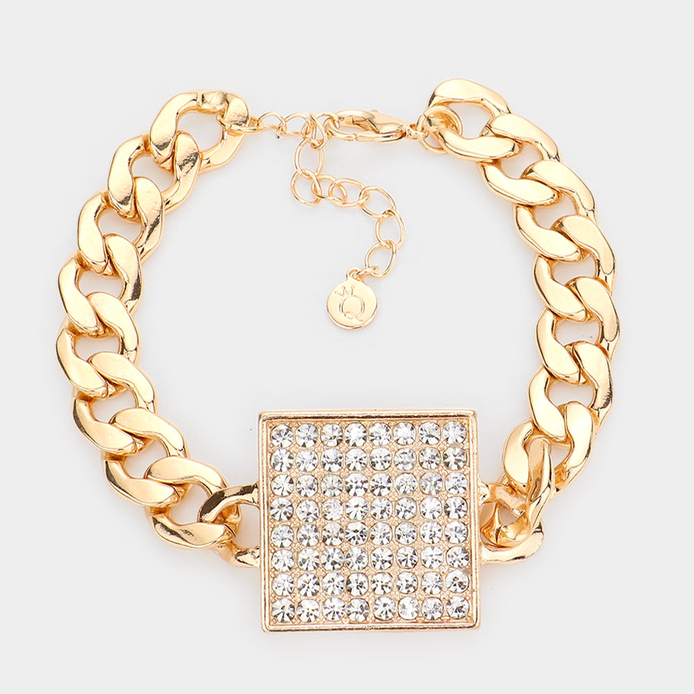 Rhinestone Embellished Square Pendant Metal Link Bracelet