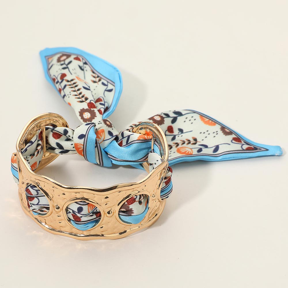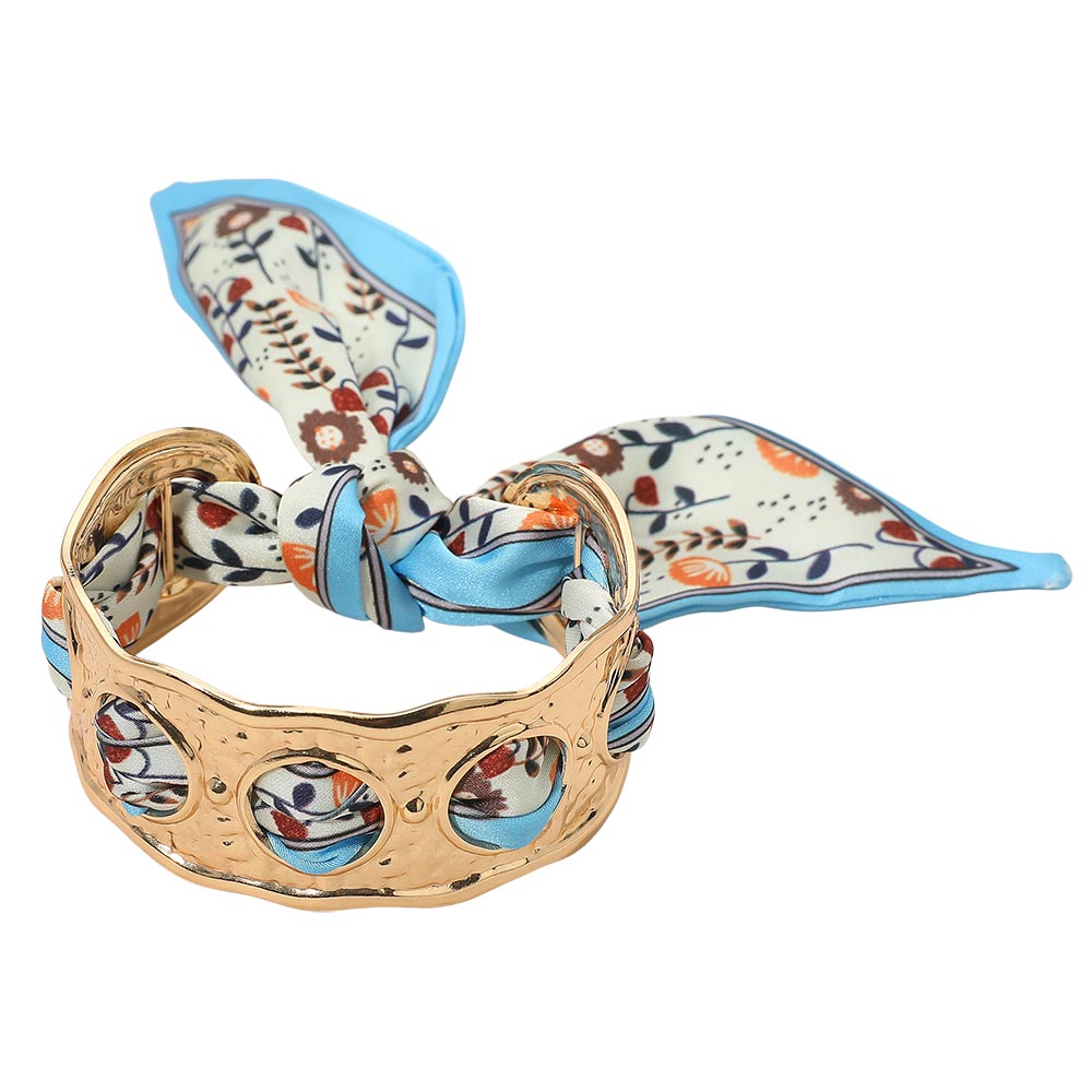 SECRET BOX_Printed Fabric Scarf Hammered Stainless Steel Open Work Cuff Bracelet