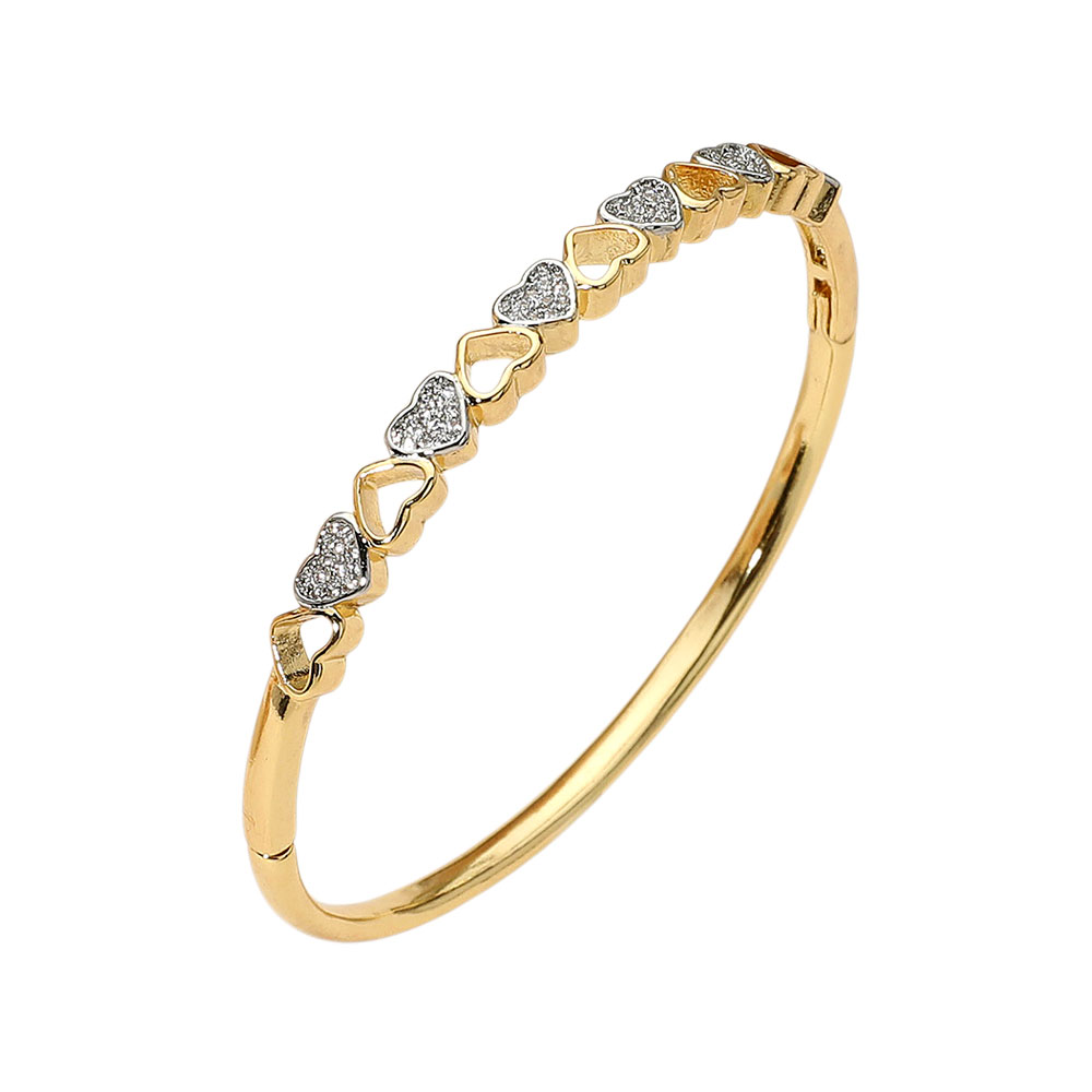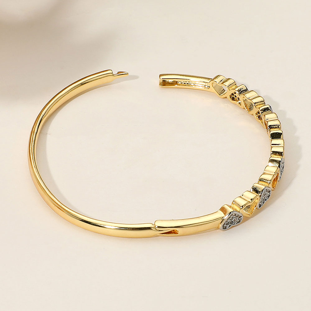 Details • Size : 0.25" H, 2.4" D • Hinged Closure • Water Resistant • Romantic bangle bracelet featuring a row of heart-shaped motifs adorned with sparkling crystal accents. A charming and elegant piece that adds a touch of love-inspired beauty to any outfit, perfect for gifting or everyday wear. • Stainless Steel