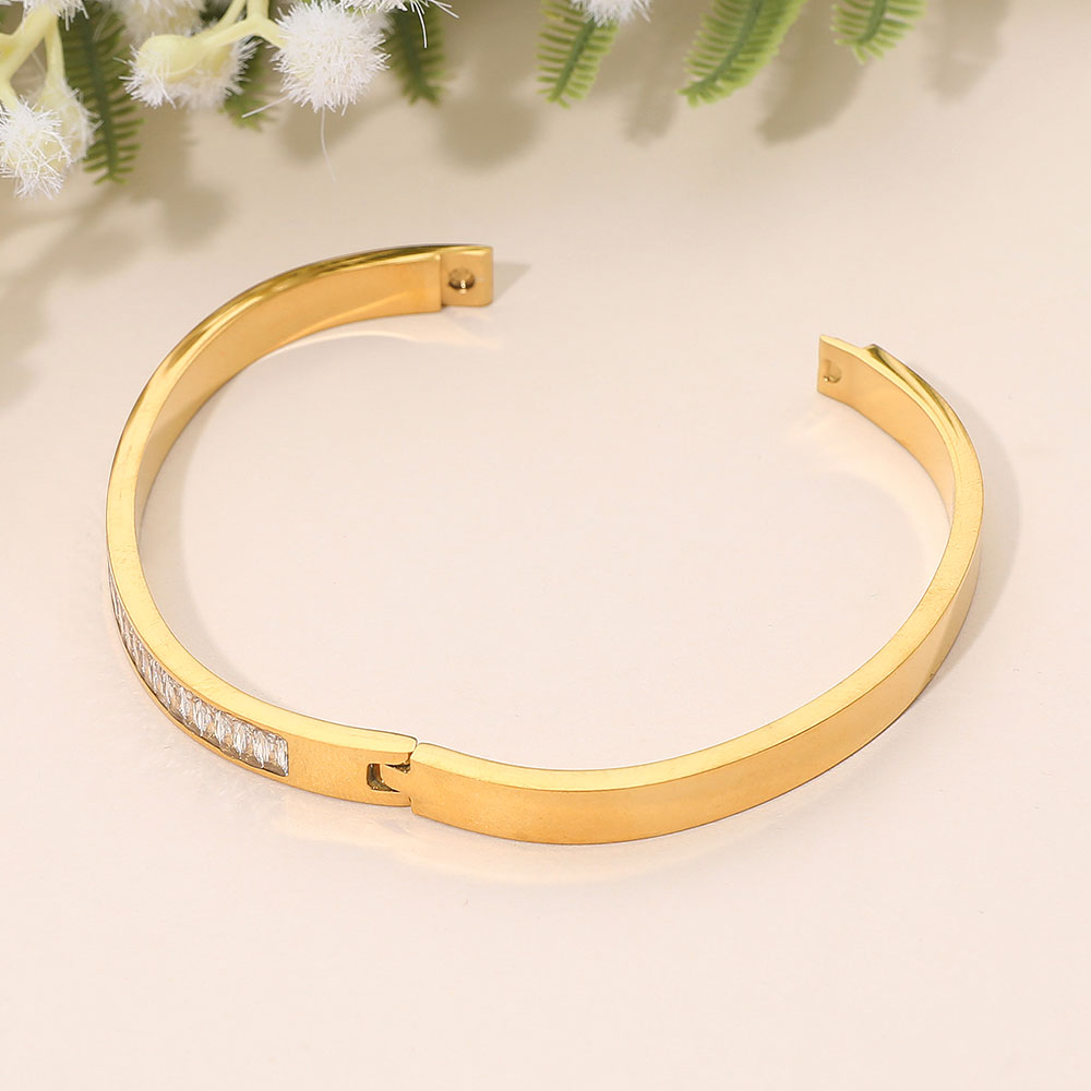 Details • Size : 0.25" H, 2.3" D • Hinged Closure • Water Resistant • Sleek hinge bangle bracelet featuring a refined row of crystal accents set along a polished silhouette for subtle sparkle and modern elegance. Designed for effortless wear, it elevates everyday outfits or completes evening looks with a timeless, sophisticated statement. • Hypoallergenic • Stainless Steel