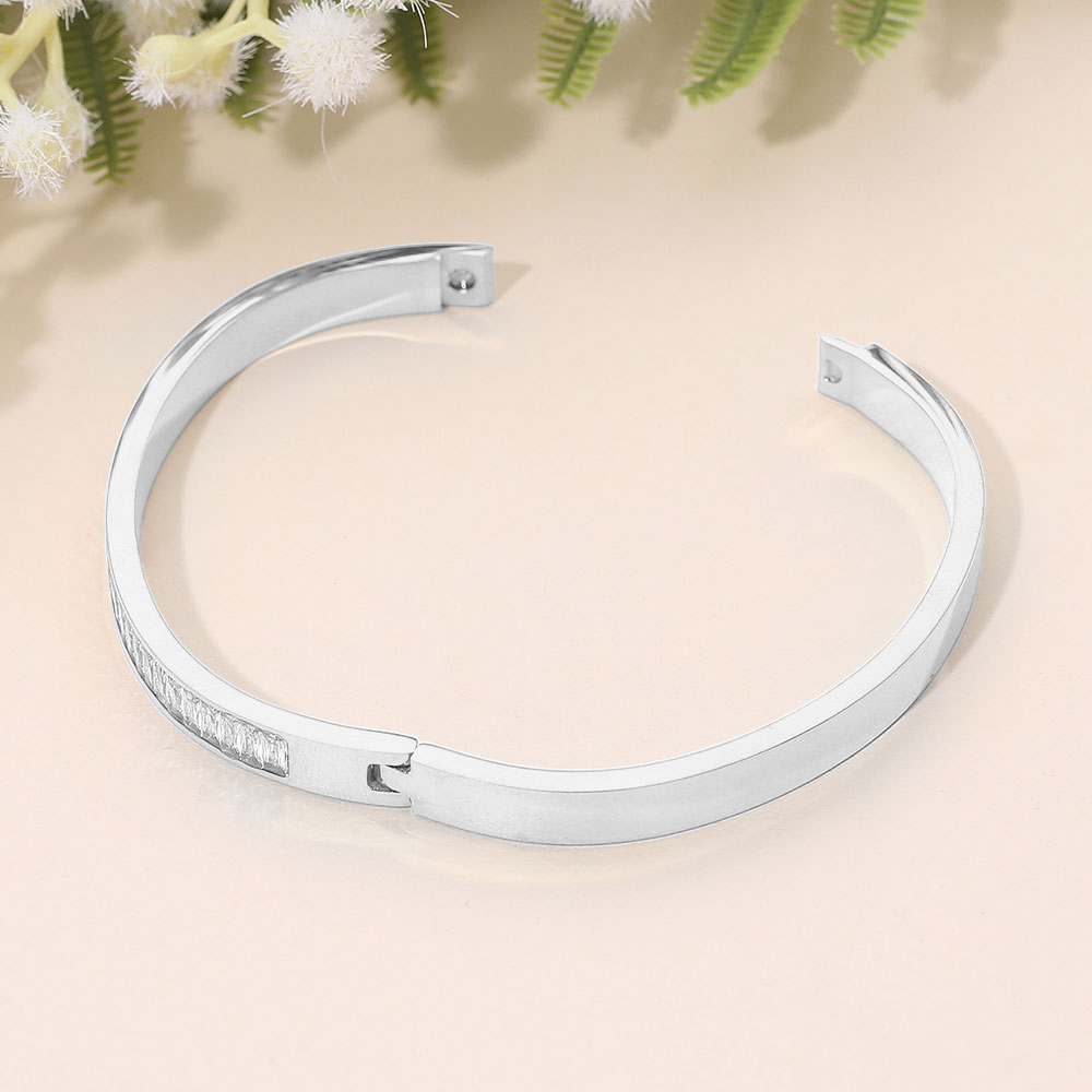 Details • Size : 0.25" H, 2.3" D • Hinged Closure • Water Resistant • Sleek hinge bangle bracelet featuring a refined row of crystal accents set along a polished silhouette for subtle sparkle and modern elegance. Designed for effortless wear, it elevates everyday outfits or completes evening looks with a timeless, sophisticated statement. • Hypoallergenic • Stainless Steel