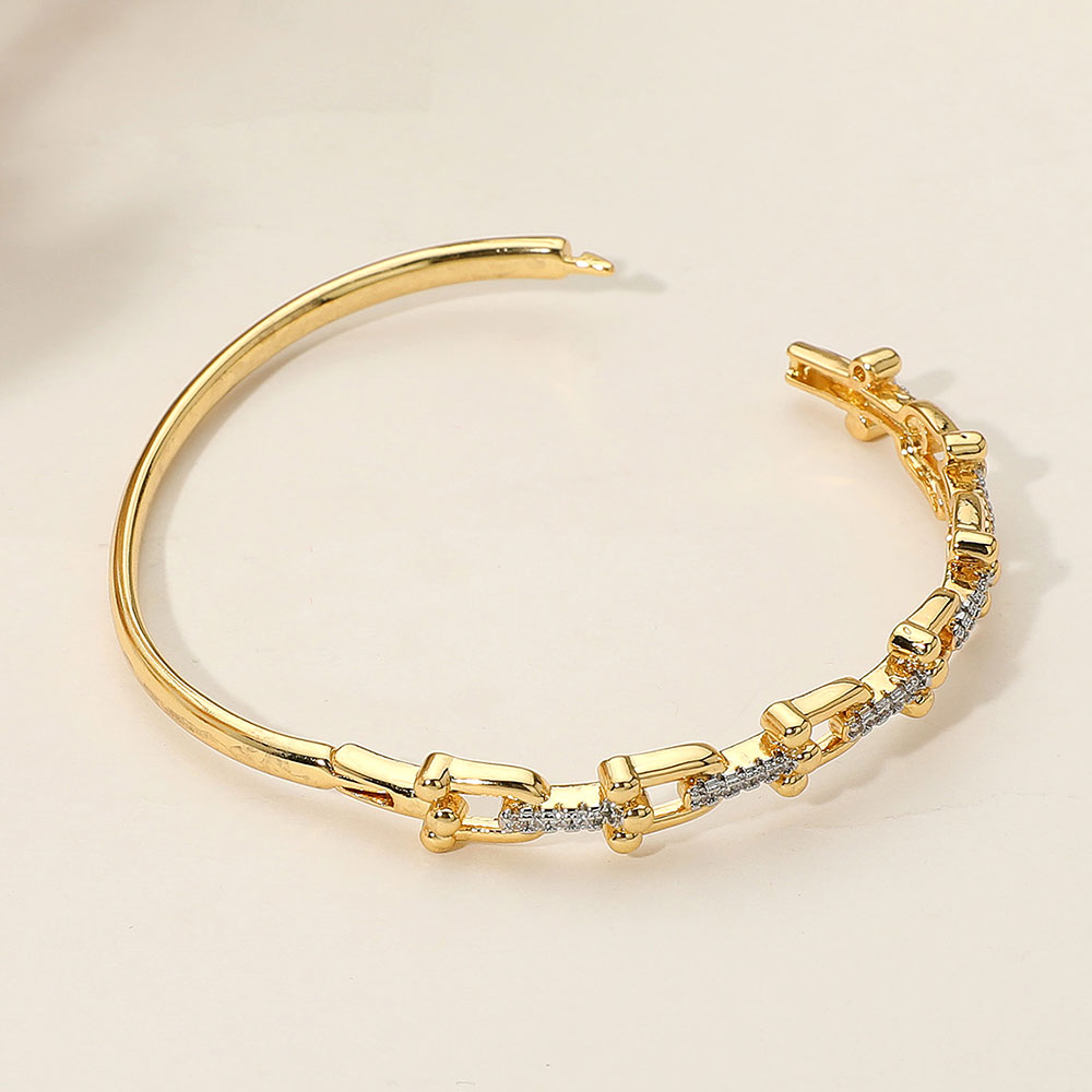 • Elegant bangle bracelet featuring interlinked geometric motifs accented with sparkling crystals. A refined and contemporary design that adds sophistication to any look, perfect for both casual and formal occasions.