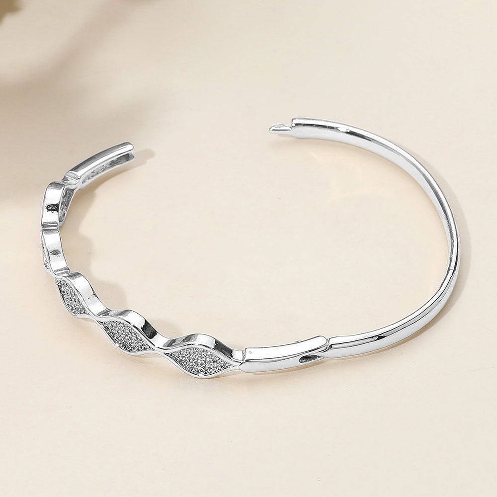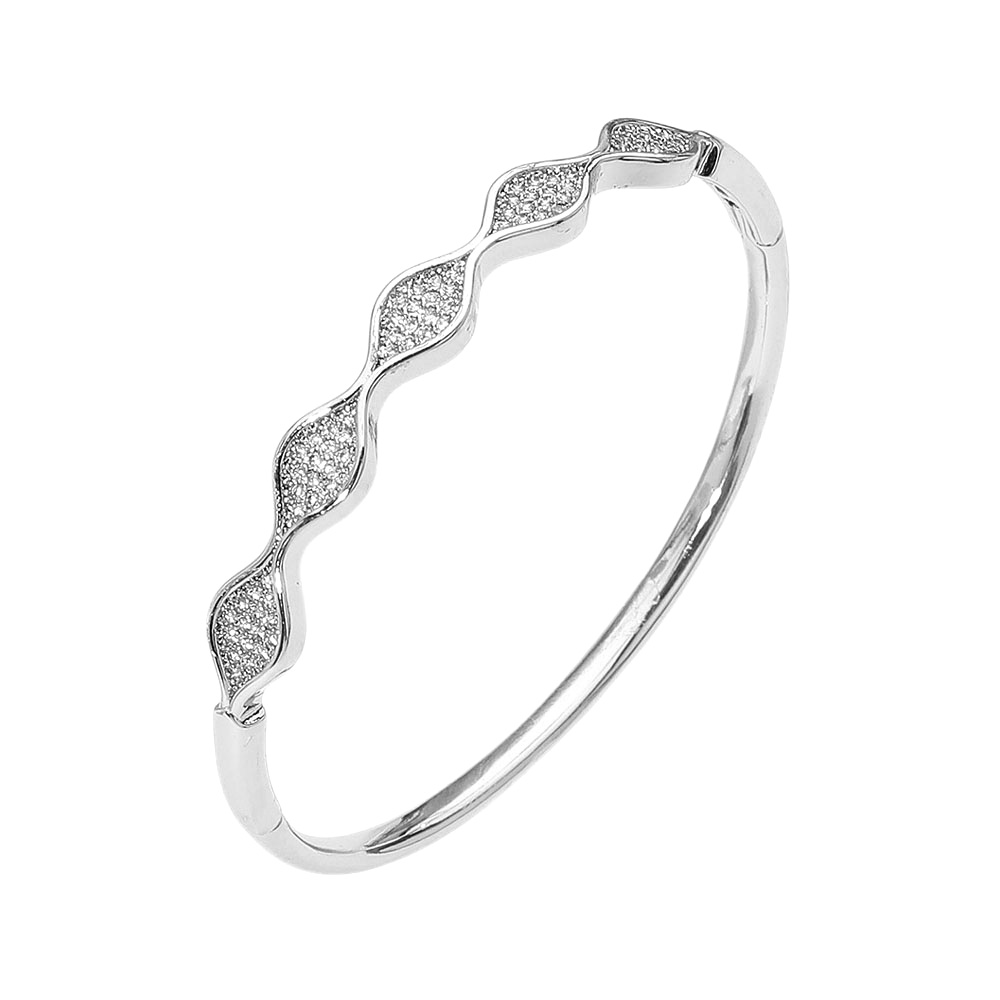 Details • Size : 0.3" H, 2.4" D • Hinged Closure • Water Resistant • Graceful bangle bracelet featuring a wavy silhouette accented with sparkling pave inlays. A refined accessory that blends fluid design with timeless elegance, perfect for adding a sophisticated touch to everyday and special occasion looks. • Stainless Steel