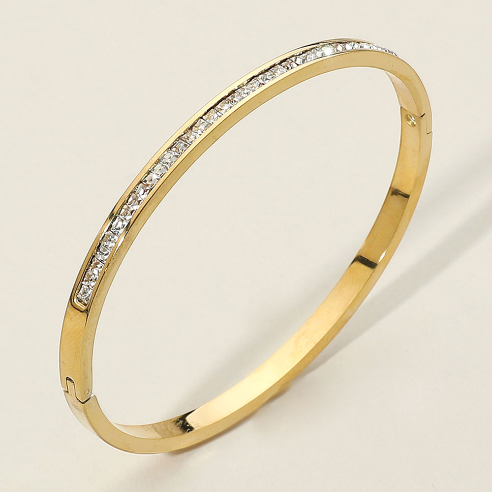 Details • Size : 0.2" H, 2.4" D • Hinged Closure • Water Resistant • Sleek hinged bangle bracelet with a row of sparkling rhinestone accents. Classic and elegant design perfect for stacking or wearing solo to add a refined touch to day or evening looks. • Stainless Steel