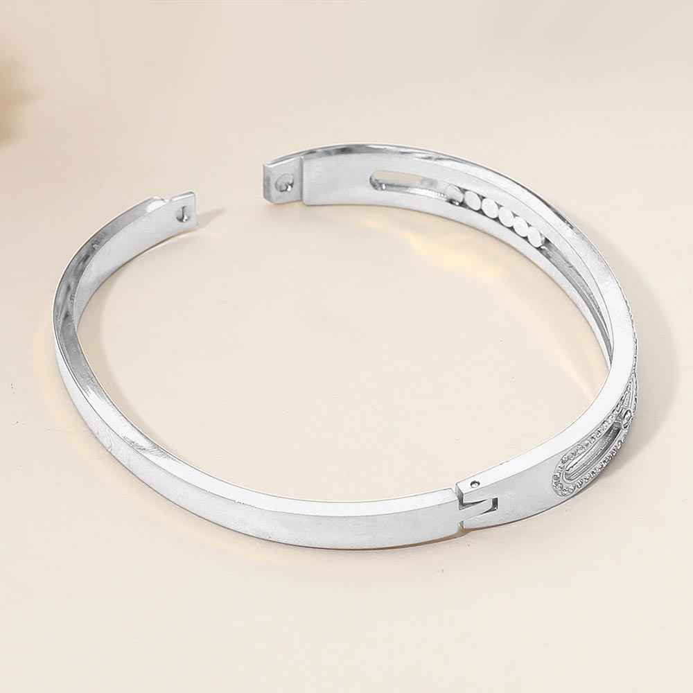 Details • Size : 0.25" H, 2.4" D • Hinged Closure • Water Resistant • Sleek and sophisticated bangle bracelet featuring shimmering crystal accents and a polished design. A timeless accessory that adds a refined sparkle, perfect for formal events, evening wear, or everyday elegance. • Hypoallergenic • Stainless Steel