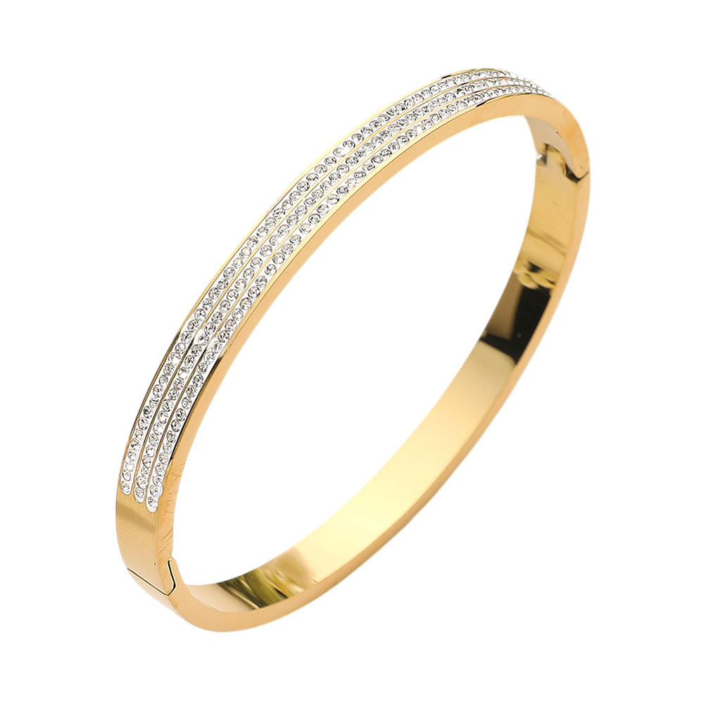 Details • Size : 0.25" H, 2.3" D • Hinged Closure • Water Resistant • Sophisticated hinge bangle bracelet featuring three rows of delicate crystal accents set into a sleek polished silhouette for radiant sparkle and refined style. Designed for effortless wear, it transitions seamlessly from everyday outfits to evening looks, adding timeless elegance when worn alone or layered. • Hypoallergenic • Stainless Steel